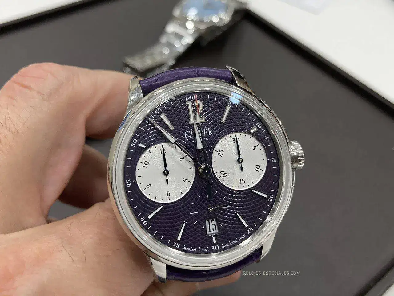 Acaba de llegarme, fuera de W&W. No es que batir a 5 Hz sea algo nuevo, pero sí lo es en Chez Patek, que además le ha metido dos mecanismos de crono independientes: uno para los segundos y otro para las décimas. En platino. Luego amplío datos. Aquí van los datos: Cronógrafo monopulsador de...relojes-especiales.com