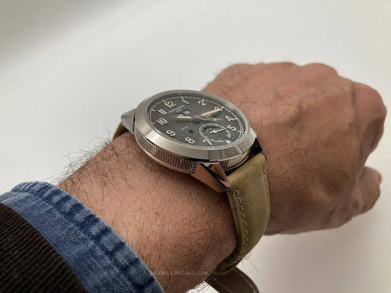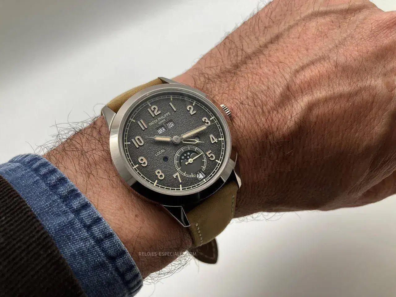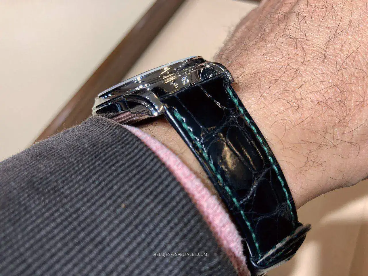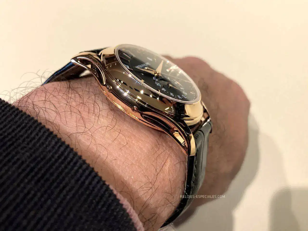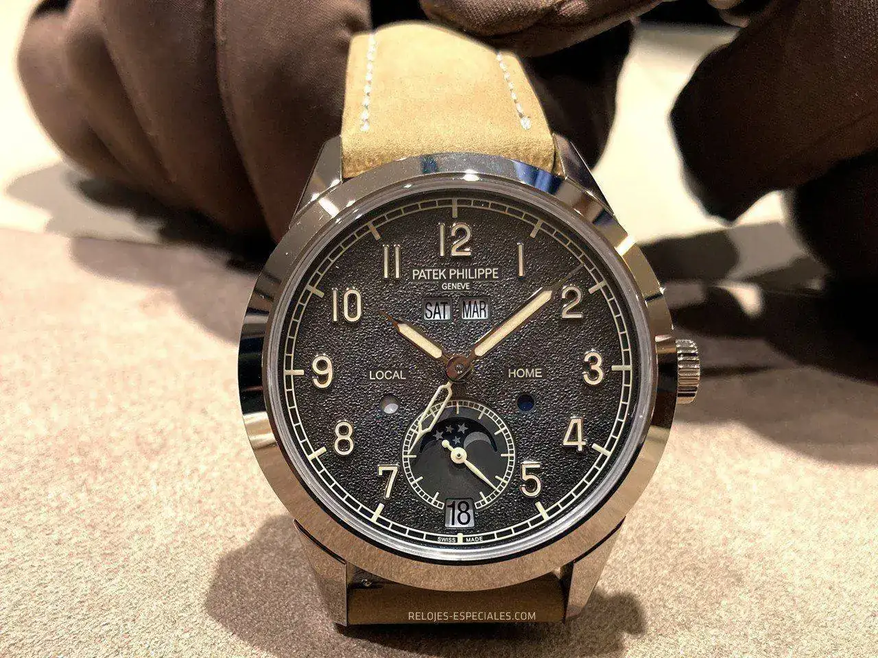 En esta misma línea estética vimos también el calendario anual referencia 5325G que además es GMT (Travel Time, como lo llaman en Patek). Con un milímetro más de diámetro (41) y hasta 11,07 de grosor, sería probablemente uno de mis tres preferidos de toda la feria (y el primer Travel Time que me gusta). Monta un nuevo calibre con un nombre larguísimo: 31-260 PS QA LU FUS 24H, algo que parecería justificado si atendemos a que incorpora ocho nuevas patentes desarrolladas expresamente para él que, entre otras cosas, permiten ajustar la fecha hacia a delante o hacia atrás indistintamente. Al igual que el Calatrava, se presenta con dos correas. Saldrá por casi 70.000 €. Si puedes conseguirlo. A pesar de que la aguja GMT da una vuelta completa en 12 horas, podemos saber si es de día o de noche en casa /home por los discos de color al efecto