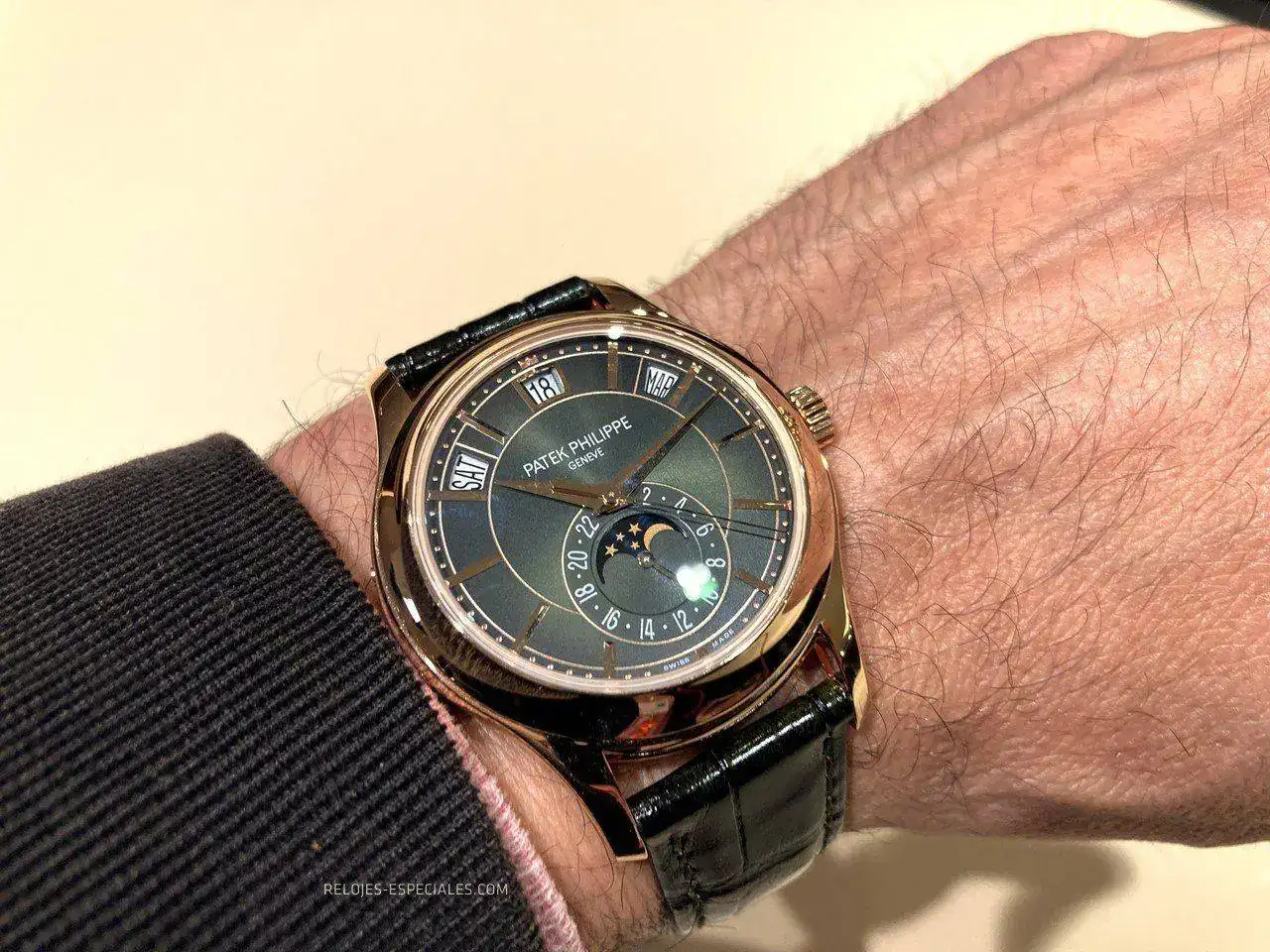 Otro calendario anual, este un poco menos discreto al ser de oro rojo, pero con un color verde de esfera que me hipnotizó. La referencia 5205R mide 40mm de diámetro (Patek goes big!) y continúa la saga presentada ya en 2010 en oro blanco. La caja en sí misma es una escultura, y si bien carece de la sencillez de los dos anteriores parecería que exhibe sus volúmenes con orgullo: sólo hay que ver el bisel cóncavo -dificilísimo de pulir- la carrura vaciada o las asas caladas. Como su nombre sugiere, el calendario anual sólo requiere de un ajuste al año, en el mes de febrero.