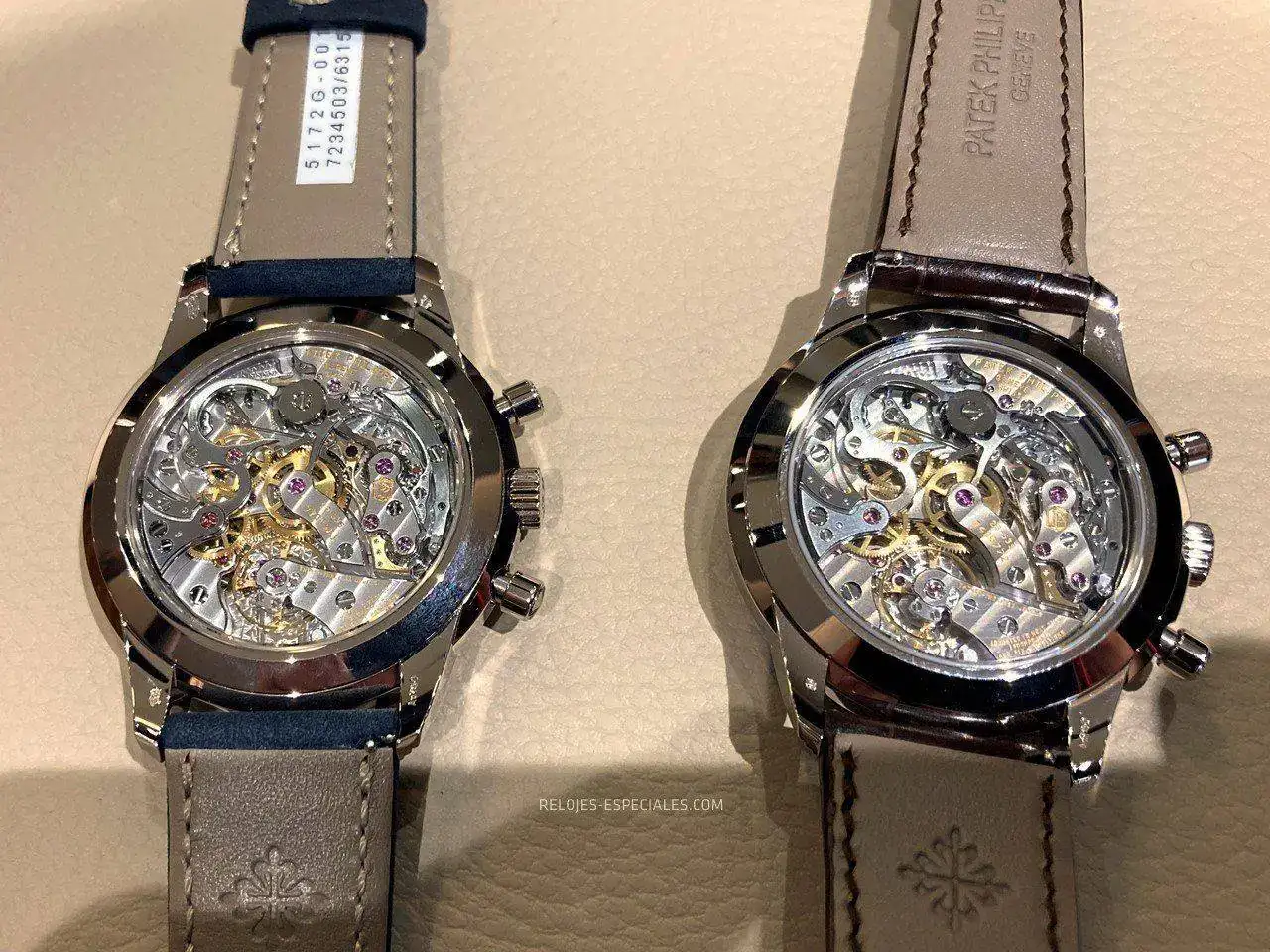 El 5172G es un cronógrafo de cuerda manual que y existía, aunque con la esfera de color azul. Esta versión con esfera opalina dorada de oro rosa añade, además del color, dos pequeños índices a las cuatro y a las ocho de las que la versión anterior carecía. Cuestión de detalle.
