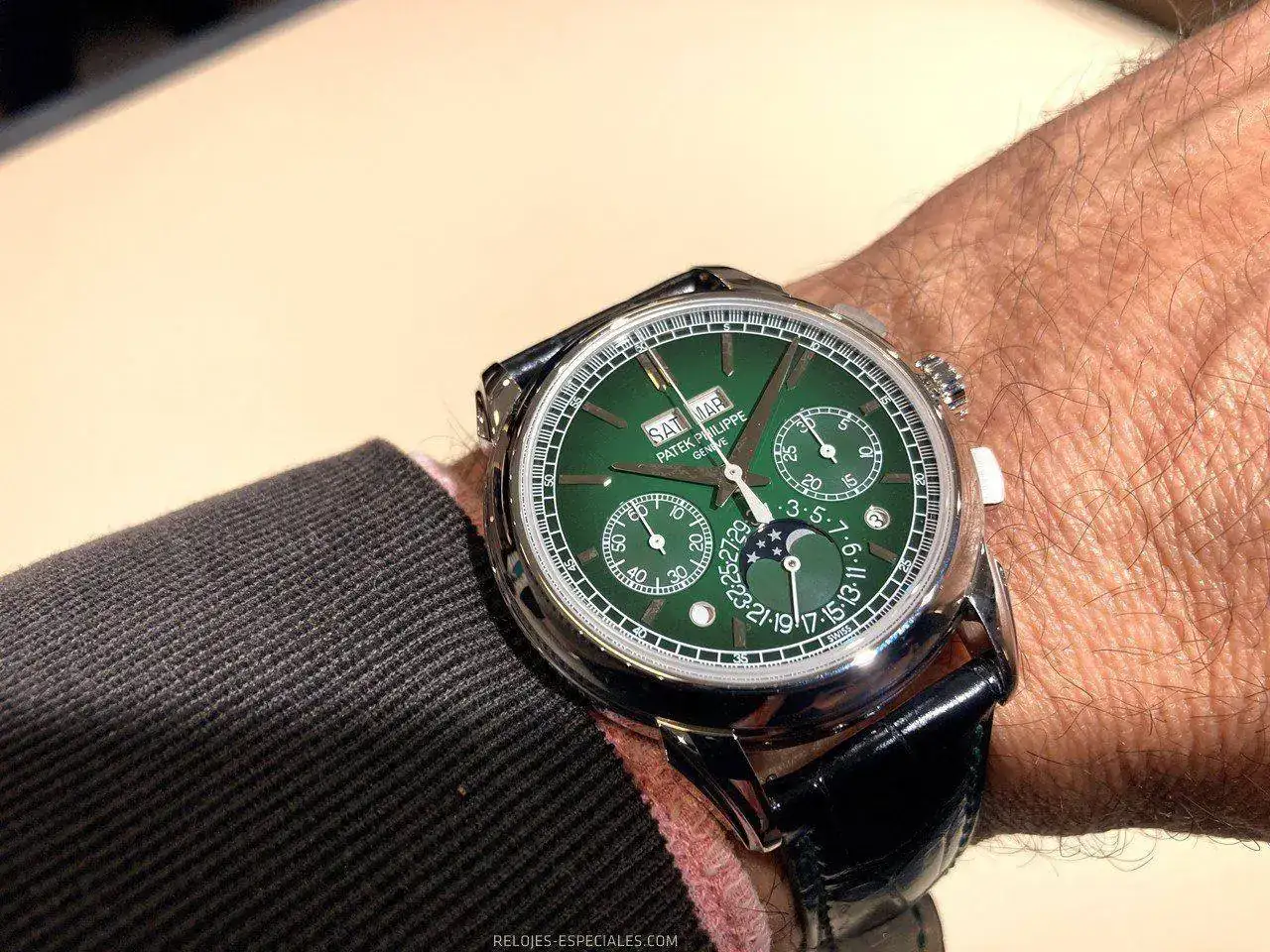 Subiendo un poco más el listón, tenemos el 5270P-014, P de platino. Y no lo dice sólo el nombre: todos los relojes en platino de Patek lucen un discreto diamante en la carrura a la altura de las seis. Al calendario perpetuo se añade la complicación cronográfica, que en este caso incorpora hasta seis patentes. De un verde intenso en la esfera, el color se reproduce también en el pespunte de la correa de cocodrilo. Fondo visto, pero dispone de otro ciego. Por 191.000 € bien lo pueden incluir.