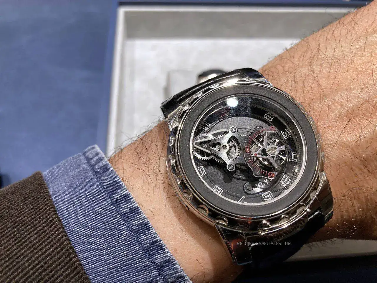 Pero el más espectacular es sin duda el Freak S (por "Sun", supongo). Se trata de un reloj con el primer doble oscilador con diferencial automático, posible gracias al sistema "Grinder", el doble de eficiente que un sistema de cuerda tradicional.