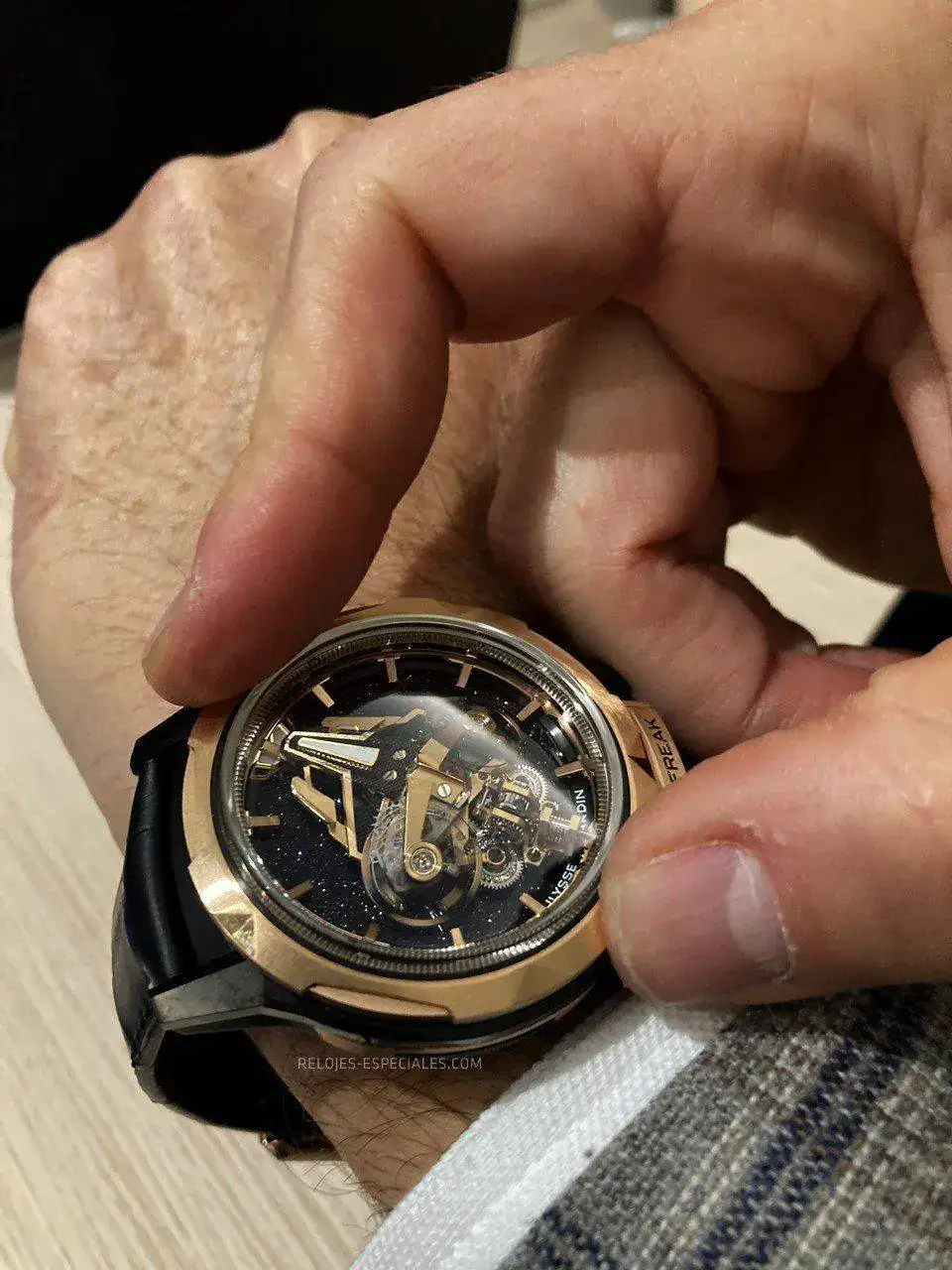 El Freak X de aventurina tiene en común con todos los Freak (invento también del maestro Oechslin) que es el propio calibre el que indica la hora rotando sobre su eje central dentro de la caja/esfera. A diferencia del original (esto es, el primero que se presentó, hace también muchos años) este presenta una manecilla horaria del que el otro carecía -y que hacía la lectura un tanto farragosa-.