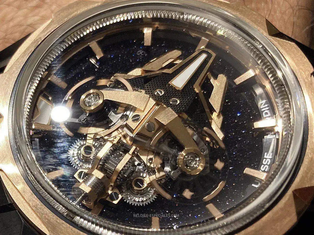 ° El movimiento está equipado con un carrusel que gira sobre sí mismo una vez cada sesenta minutos para indicar la hora. Sirve como un minutero que gira sobre la placa de aventurina que decora el movimiento.