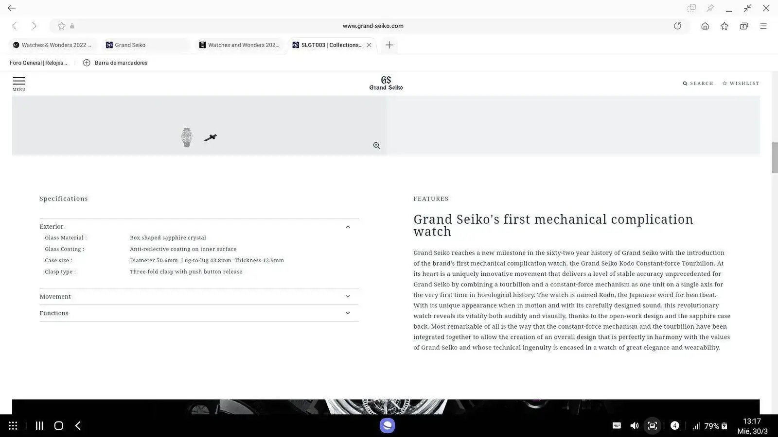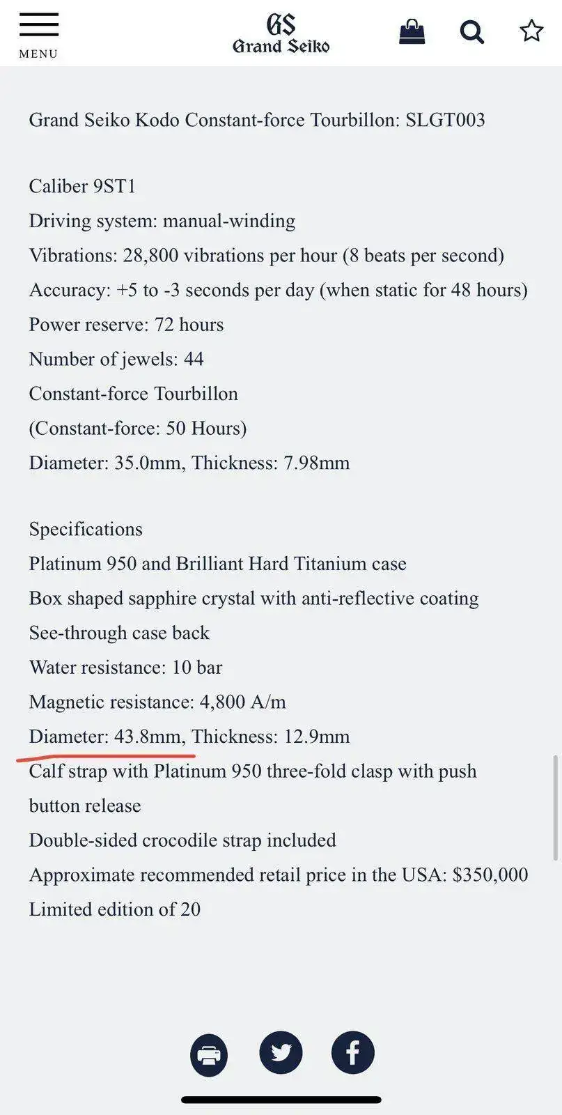 ¿Dónde has visto eso? Porque en la web pone otra cosa: 43.8 mmEste GS Tourbillon de fuerza constante, canela fina