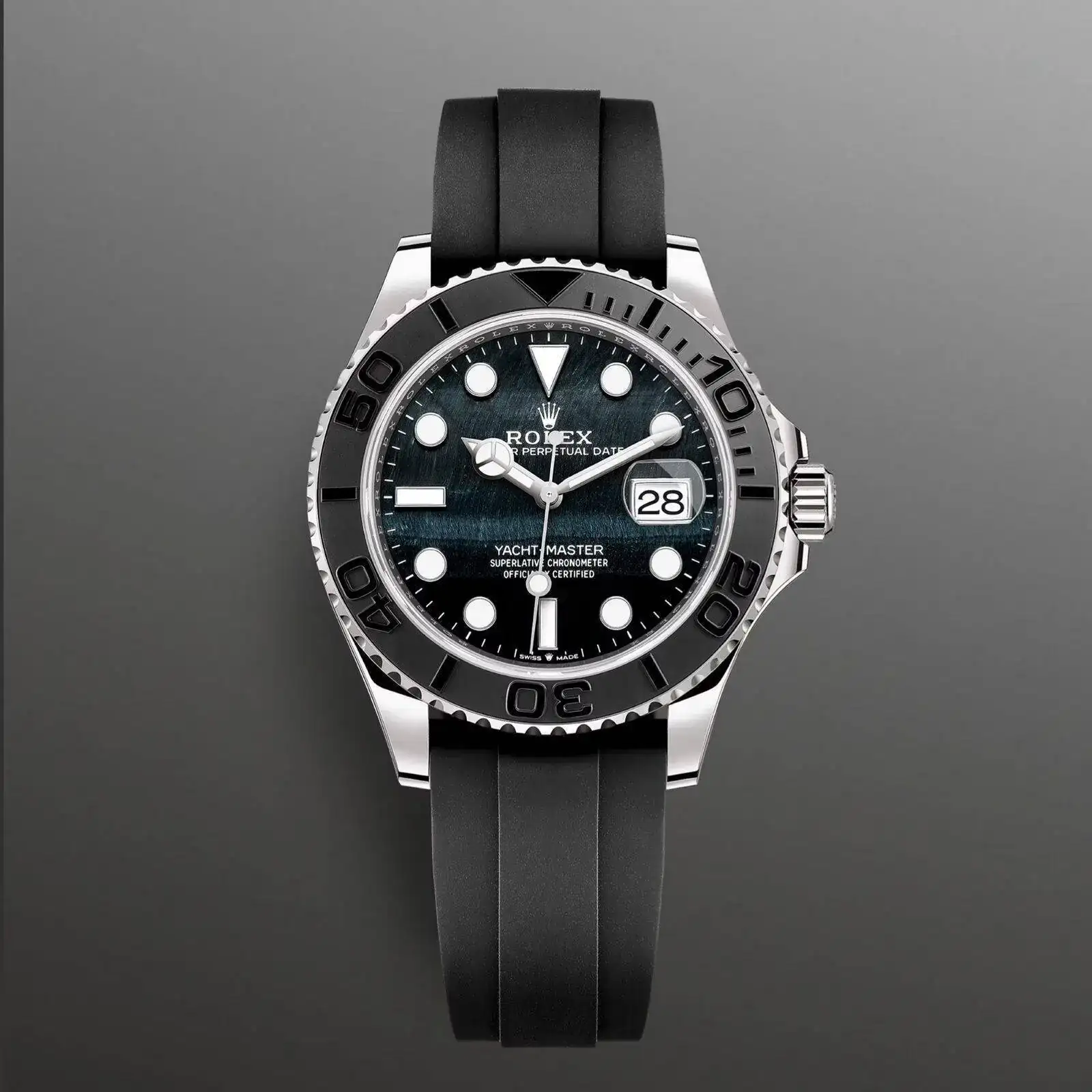 El bisel es de oro sólido, al igual que la corona y los pulsadores del cronógrafo, mientras que los eslabones centrales de oro de la pulsera en realidad no son de oro sólido, sino que los eslabones de acero llevan una capa gruesa de oro. Este es un buen compromiso, ya que tienes unos milímetros de oro, por lo que incluso si tienes un rasguño profundo, sería muy poco probable que vieras el acero debajo en lugar de los relojes chapados en oro, donde los arañazos pueden revelar el acero debajo con bastante facilidad. Obtienes todos los beneficios, pero sin el aumento masivo de precios y sin el peso del oro sólido.