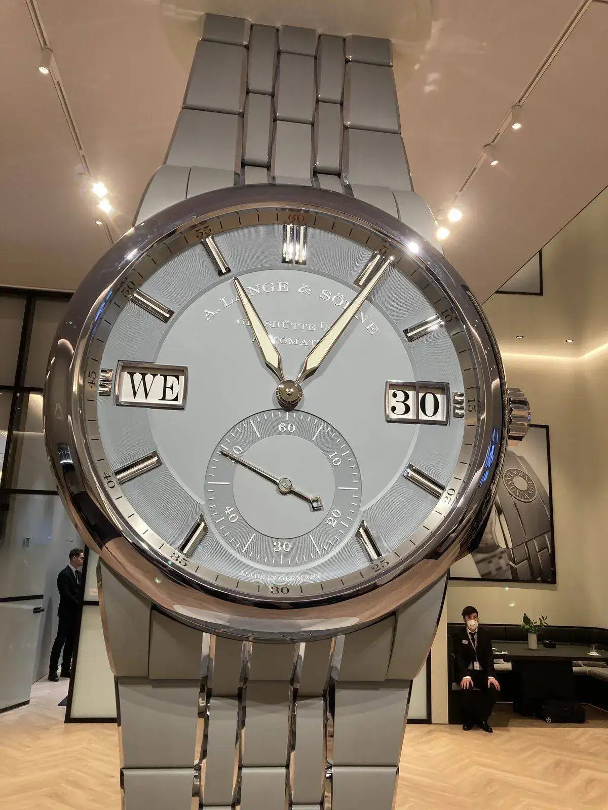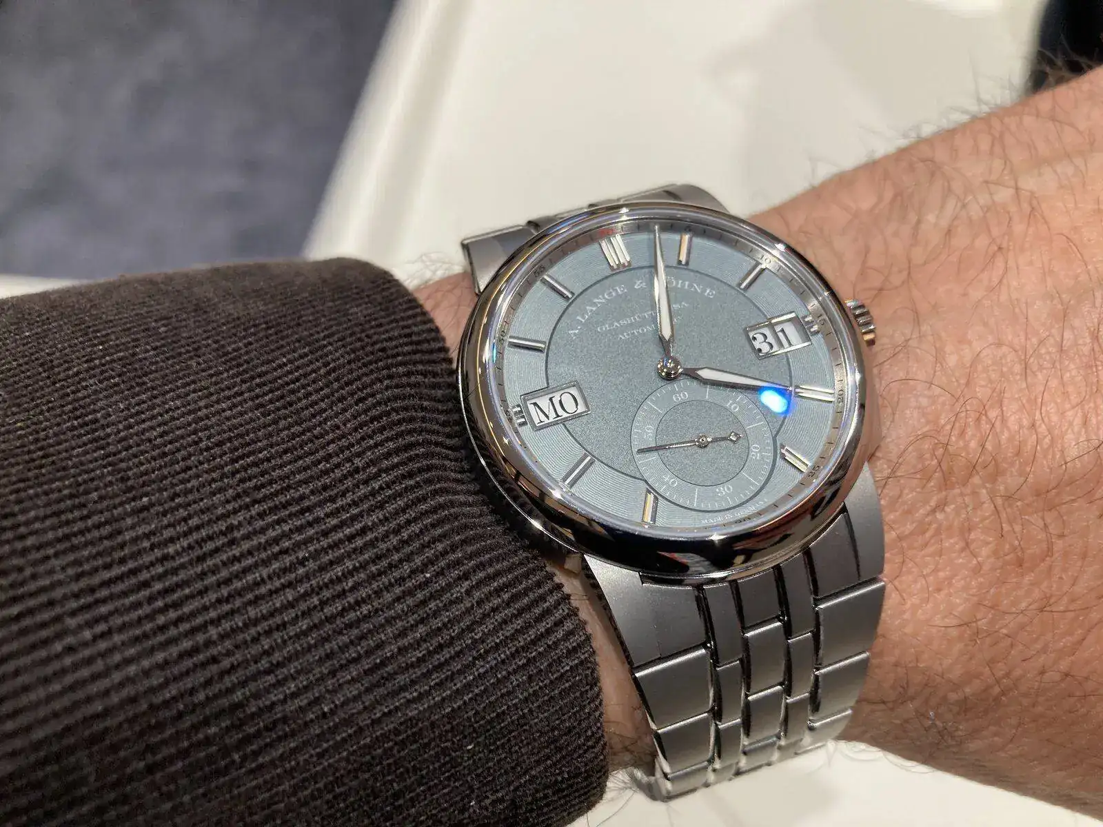 El Lange Odysseus de titanio. Otra pasada, sobre todo en cuanto a calibre, ejecución y acabados. Pero, debo admitir que esa ligereza le quita- para mí- empaque. Está a la altura de lo que uno podía esperar de Lange, pero si dispusiera de los 55.000 € que piden por él seguramente “ahorraría un poco más” e iría por el Moser…