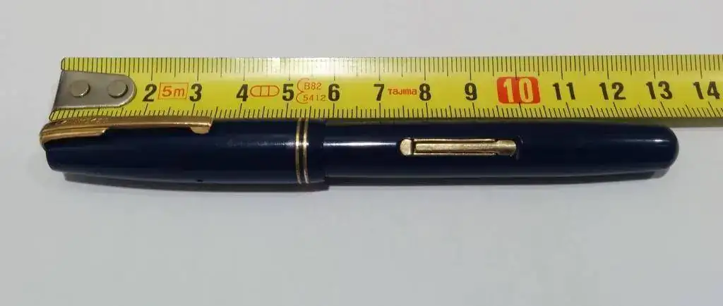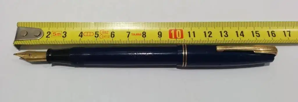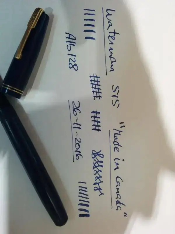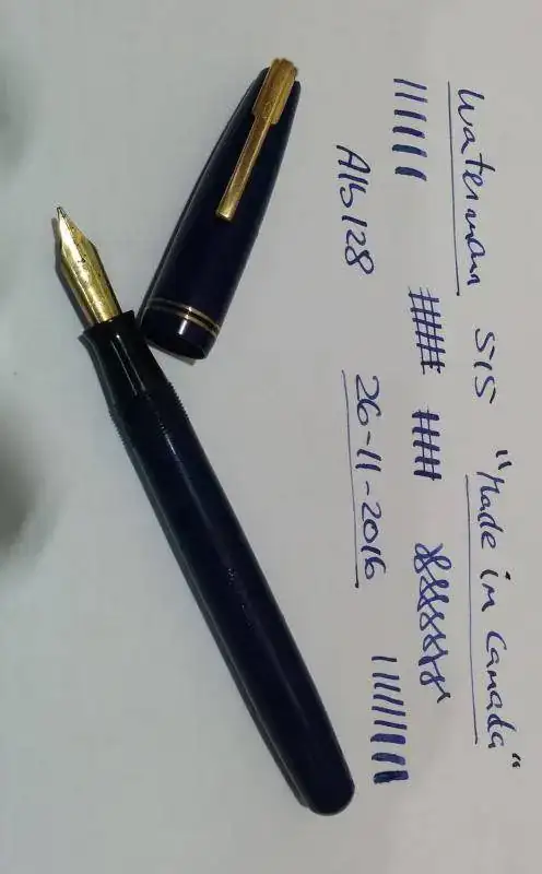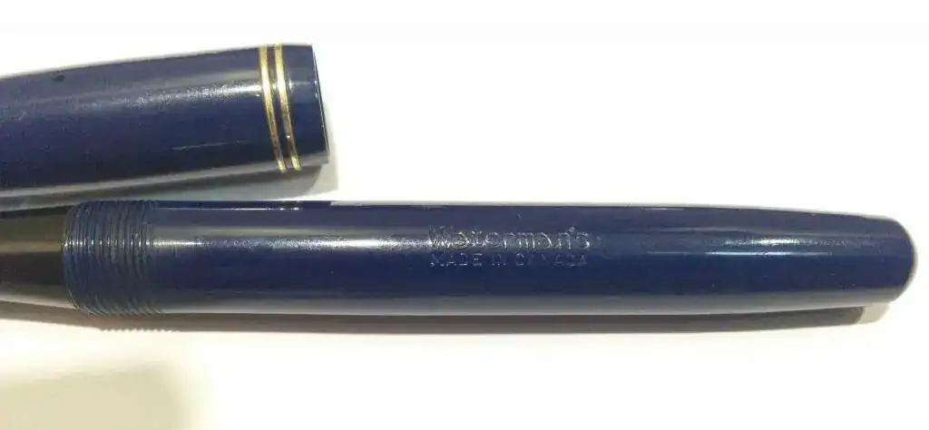 Hola, ponga a la venta esta waterman "made in canada". Cuando se fabricaba en Inglaterra se llamaba 515 y en America W5. Color azul marino (en la ultima foto se aprecia mejor el color real, en las otras el movil lo cambia bastante, pero el real es azul marino). Es de los años 1940-1950. Plumin del nº5 de oro punto M muy jugoso (lleva inscrito waterman´s ideal 14k canada y en un lateral F.D.W. que son las iniciales del fundador de wateman). En el lateral lleva la incripción claramente visible waterman´s canada y el sistema de carga es por palanca (tiene el saco recien cambiado). Los dorados estan bastante bien conservados y solo tiene microrayazos normales debido a su edad.