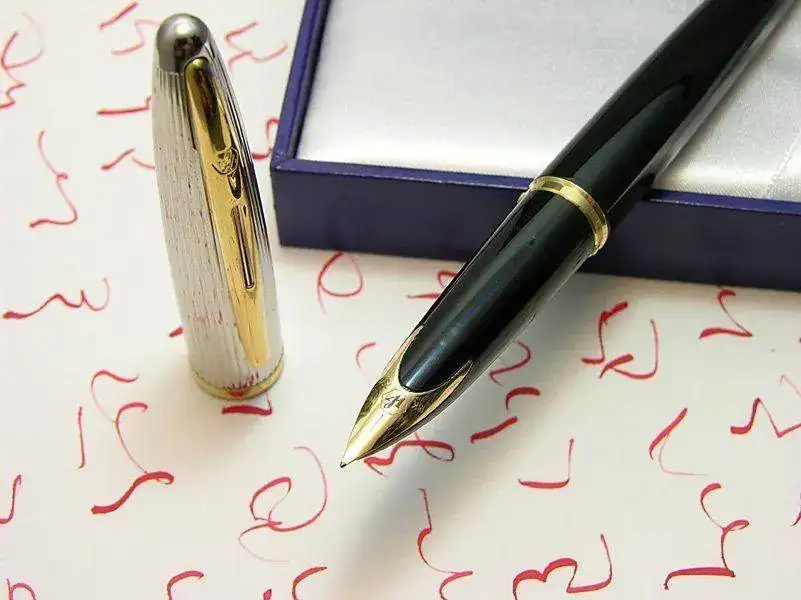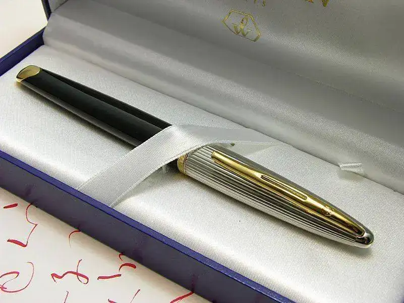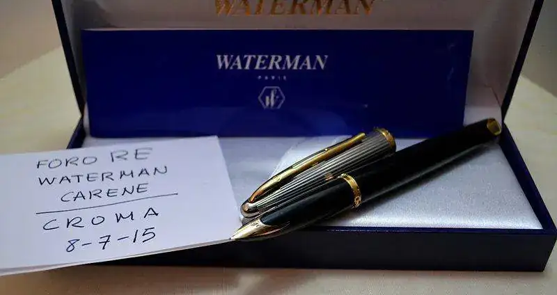 Con los debidos permisos, ofrezco para su venta esta estilográfica WATERMAN CARENE en acabado lacado negro con capucha metálica plateada y detalles en dorado.