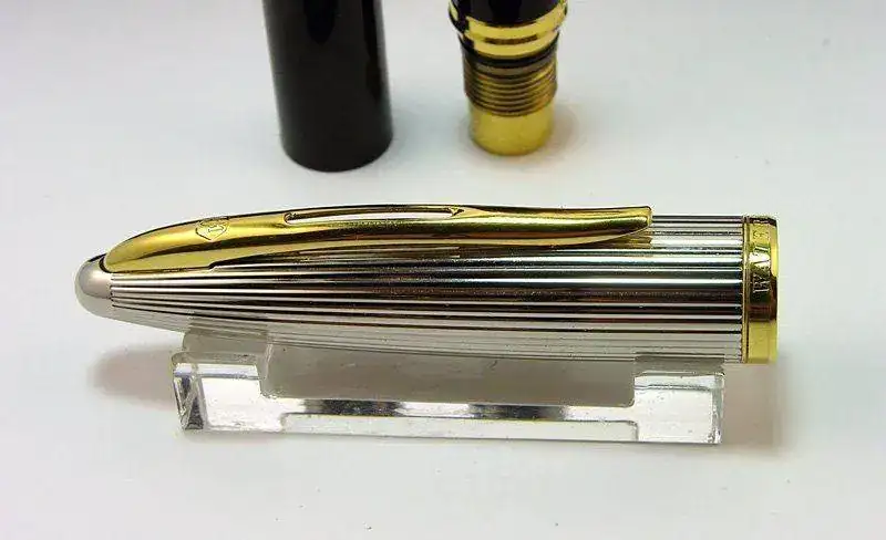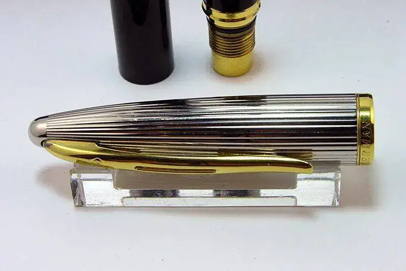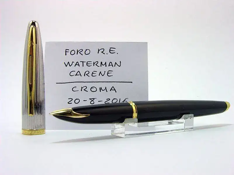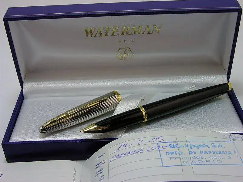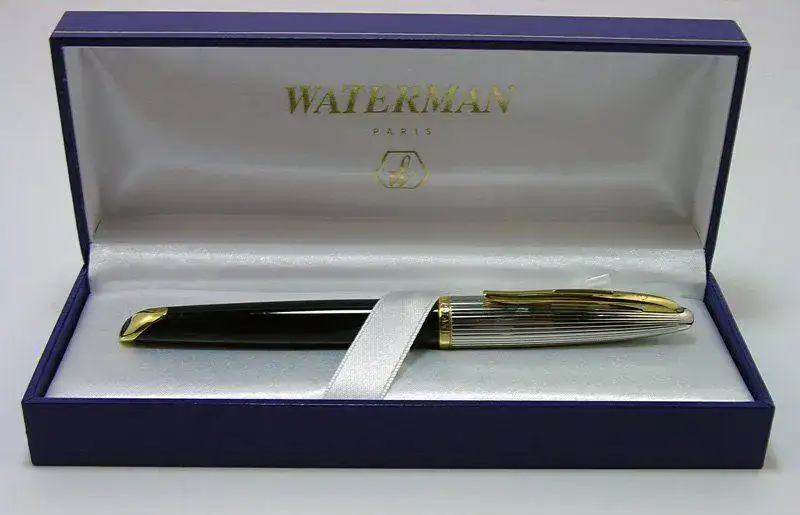 Ofrezco para su venta esta estilográfica WATERMAN CARENE LUXE en acabado lacado negro con capucha metálica plateada y detalles en dorado.