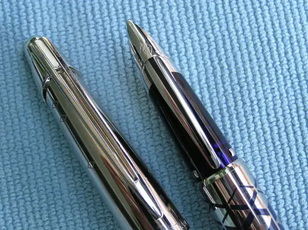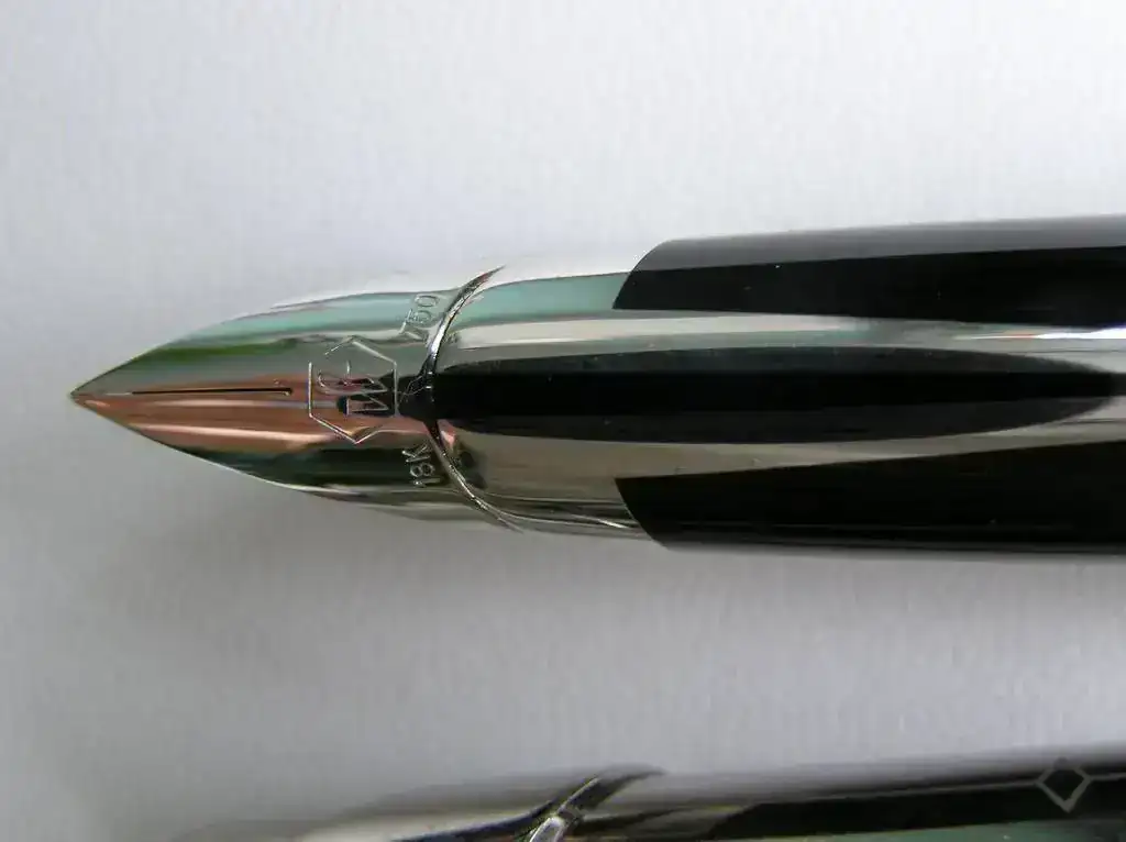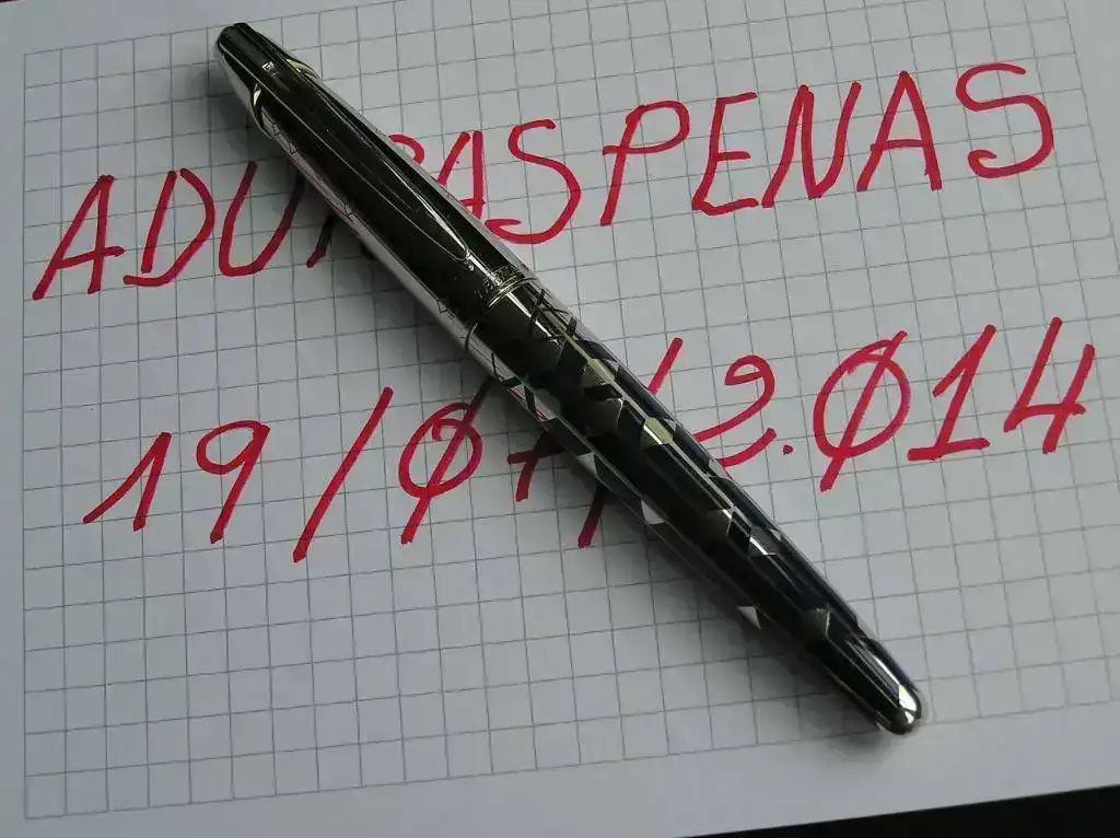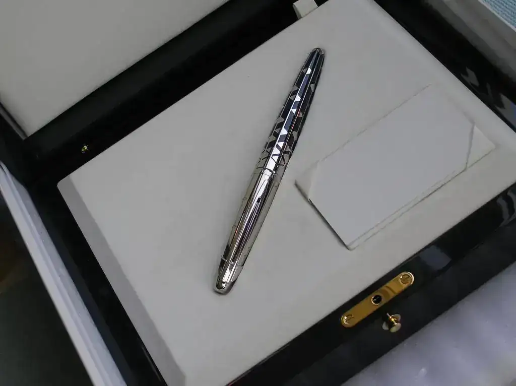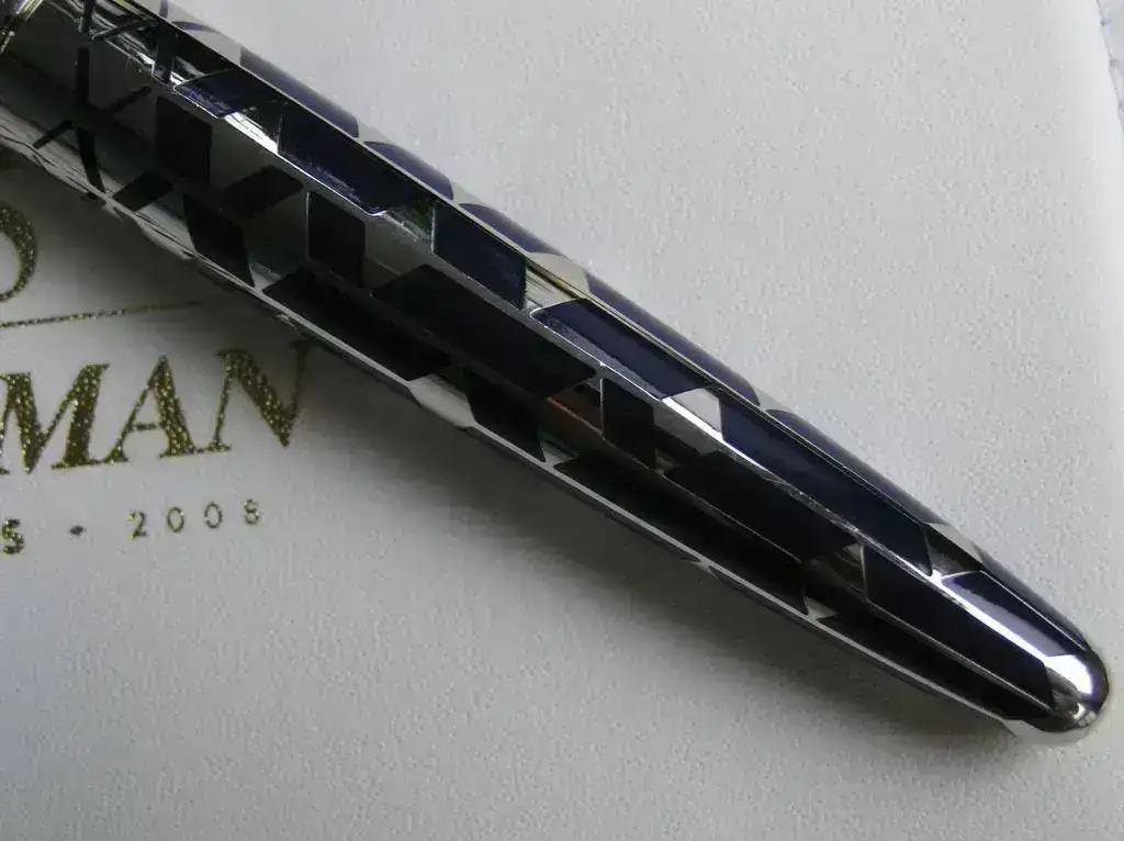 El capuchón también lleva baño de paladio con una decoración grabada en lugar de los insertos de laca. El plumín es de oro de 18 k con un baño de rodio.