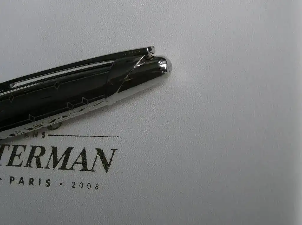 Está completamente nueva sin usar aunque tiene una pequeña abolladura justo en el extremo del capuchón, producto de un golpe, que es como acaban siempre estas cosas con forma ojival por culpa del Sr. Newton y su ley de la Gravedad. En este caso la cosa no es de gravedad más allá del aspecto estético pero hace que el precio de la pluma baje. Creo que se aprecia bien en las fotografías.