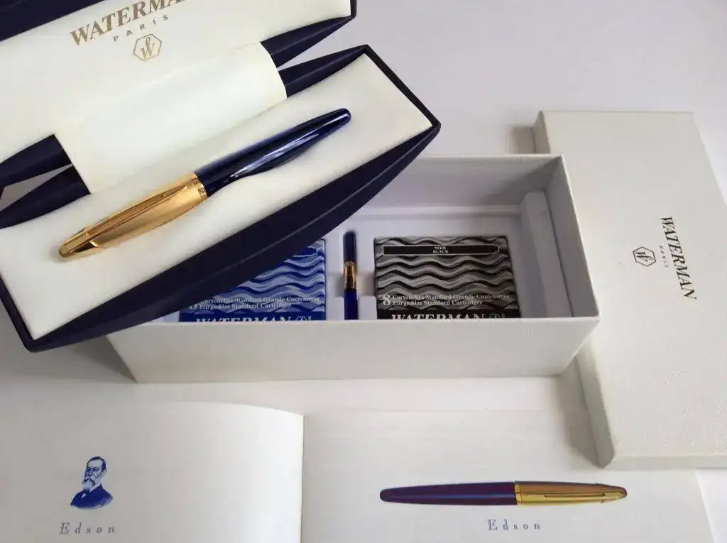 Waterman Edson Sapphire en estado nos, punto fino, con cajas y documentación completa. 500 €. Se entrega en mano en Zaragoza o en Madrid.