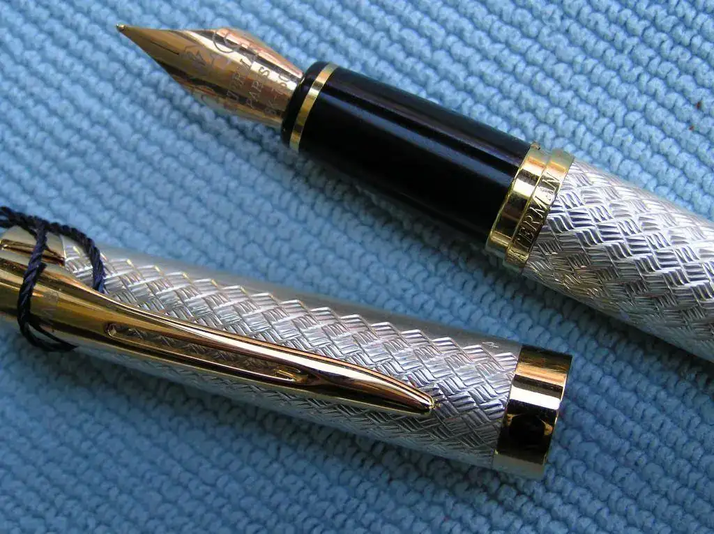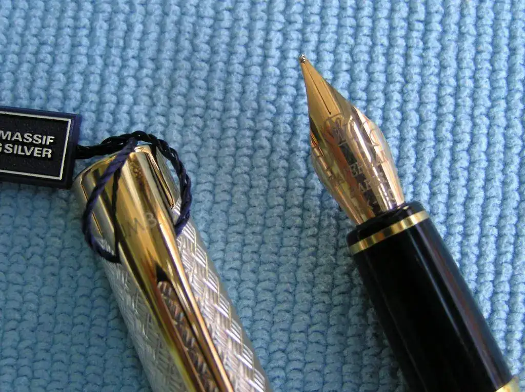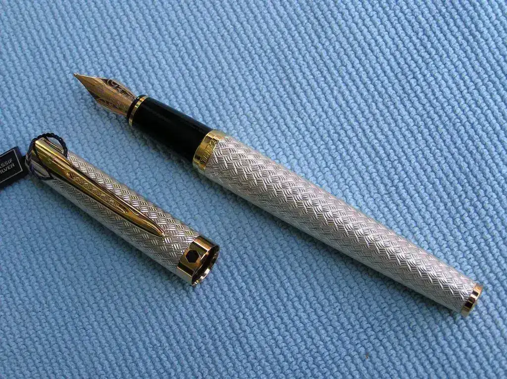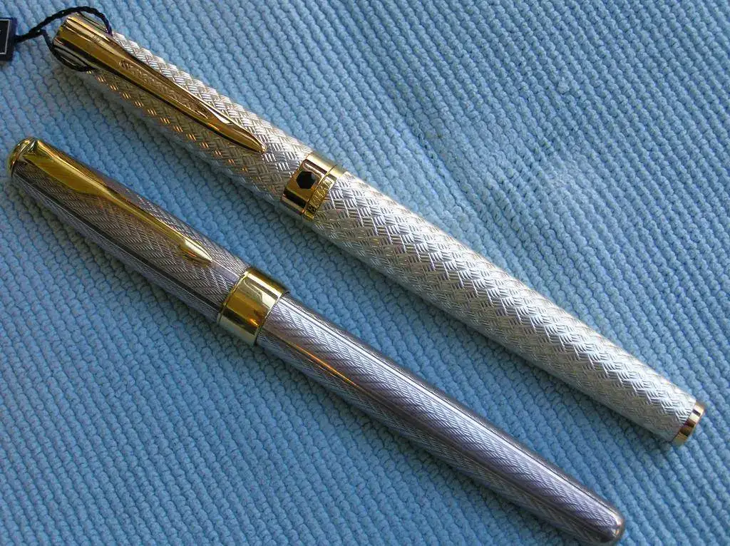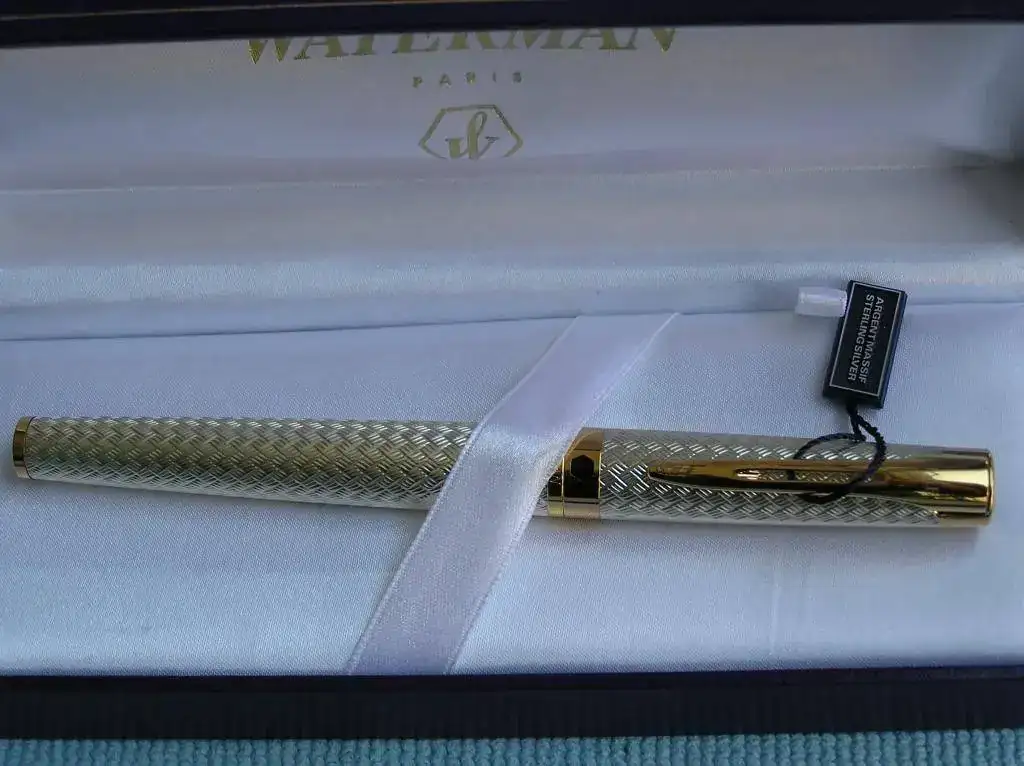 La pluma que pongo a la venta es una Waterman L’etalon en plata maciza. Está completamente nueva sin haber sido nunca entintada y va en su correspondiente caja con su alimentador. En el clip lleva las iniciales JMB grabadas con laser o algún procedimiento similar porque no se aprecia relieve. El diseño de capuchón y cuerpo es del tipo basketweave(estera).