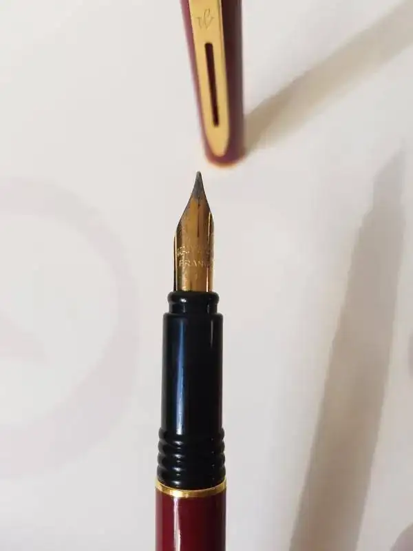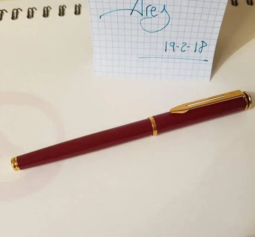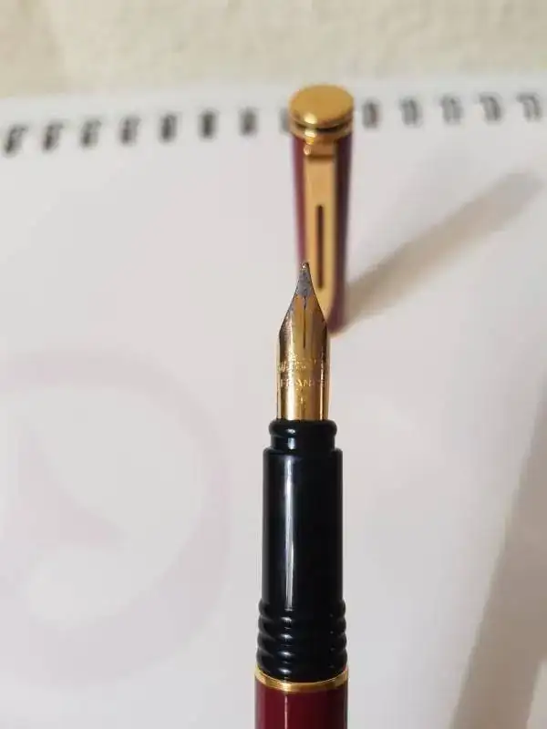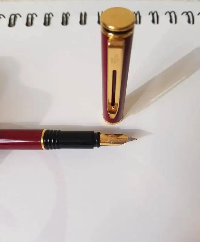 A la venta esta Waterman de los años 80 fabricada en Francia en metal lacado en color rojo o granate. El sistema de carga es por convertidor (no lo lleva) o cartuchos. El plumín es fino en acero con un baño dorado. Como se aprecia en las fotos el baño dorado se ha ido deteriorando con el paso del tiempo pero naturalmente no afecta a su desempeño en la escritura. Mide 138 mm cerrada y 123 mm sin el capuchón. Buen estado en general a excepción de la perdida del baño dorado en el plumín. Precio 35 euros envío certificado incluido. Saludos.