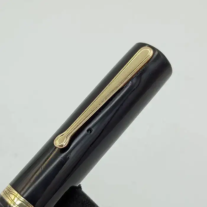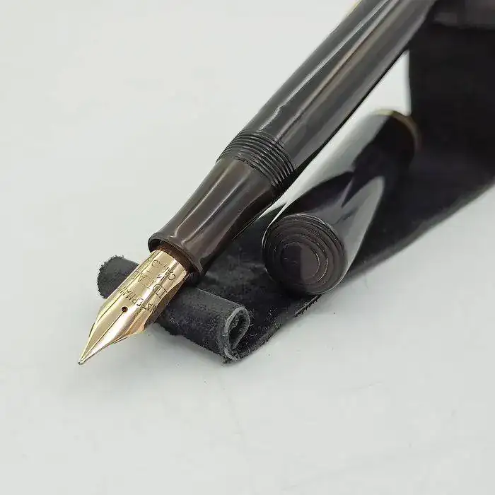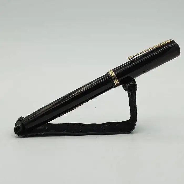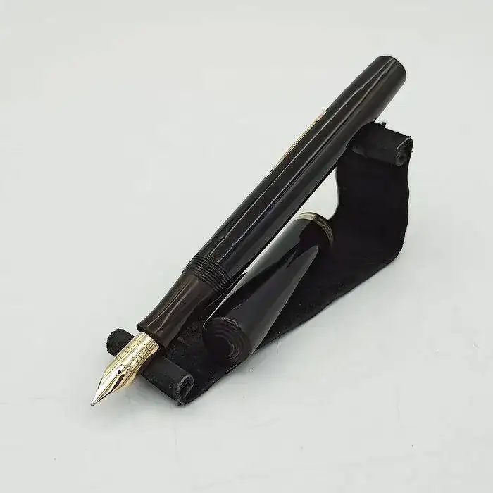 La estilográfica en cuestión está fabricada en celuloide, el cuerpo en un precioso negro brillante y la boquilla en un marrón oscuro, Clip, palanca de carga y anillo del capuchón chapados en oro, por lo que he podido sacar en claro es de principios de 1930.