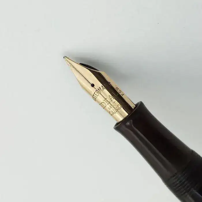 El plumín está decorado con: WATERMAN'S, IDEAL, 14 KT. CANADA, así mismo en un lateral hay 3 letras FDW, son las iniciales de Frank D Waterman, sobrino de Lewis Waterman que se hizo cargo de la compañía en 1901 cuando este murió, según tengo entendido estas 3 letras aparecen en la gran mayoría de las plumas Canadienses de la marca y en algunas inglesas de la época.