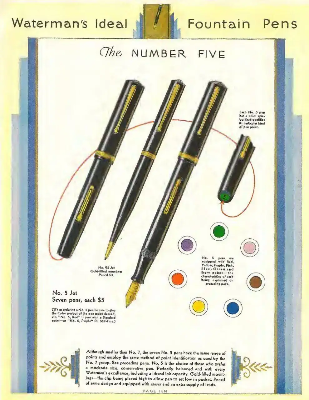 En el sombrerete del capuchón se puede ver labrado un círculo central al que rodean 4 circulas concéntricos que van descendiendo, en el cuerpo de la pluma puede leerse en 3 líneas: WATERMAN'S, MADE IN CANADA (con el emblema de la casa) y FOUNTAIN PEN, así mismo en la parte posterior de la pluma un N.º 5 labrado.
