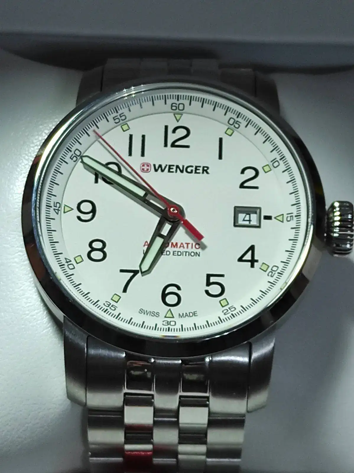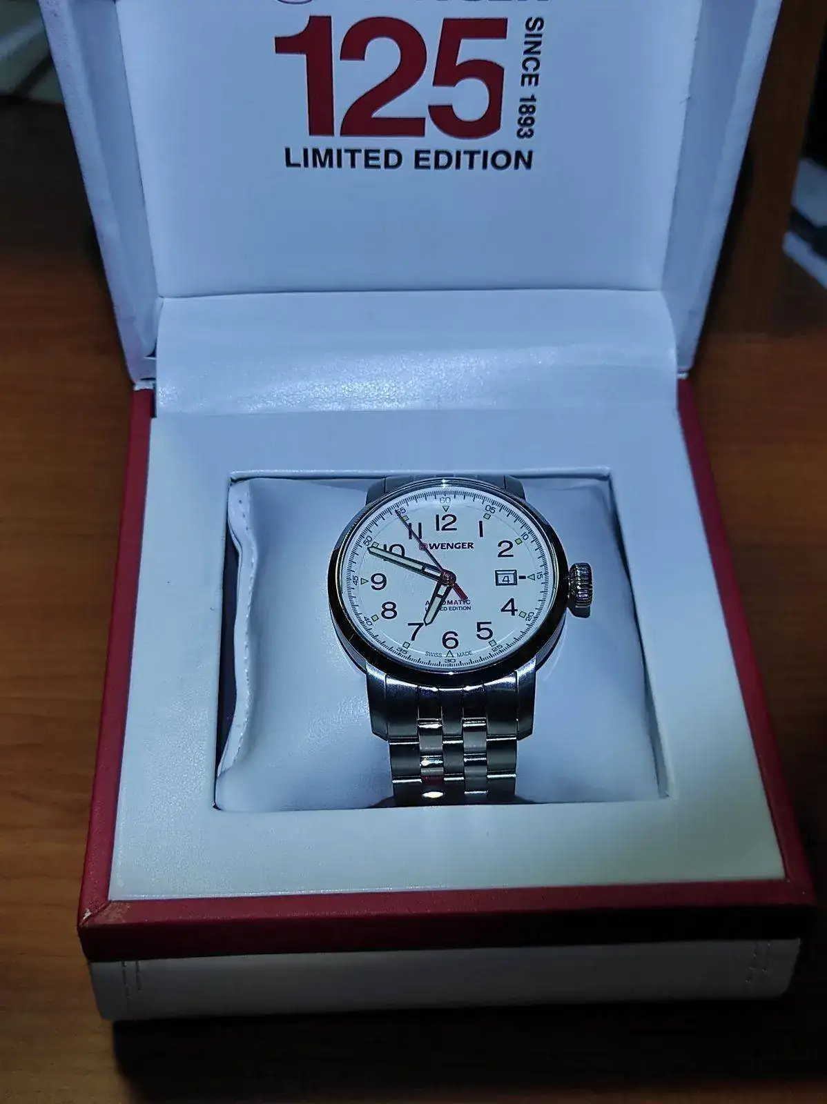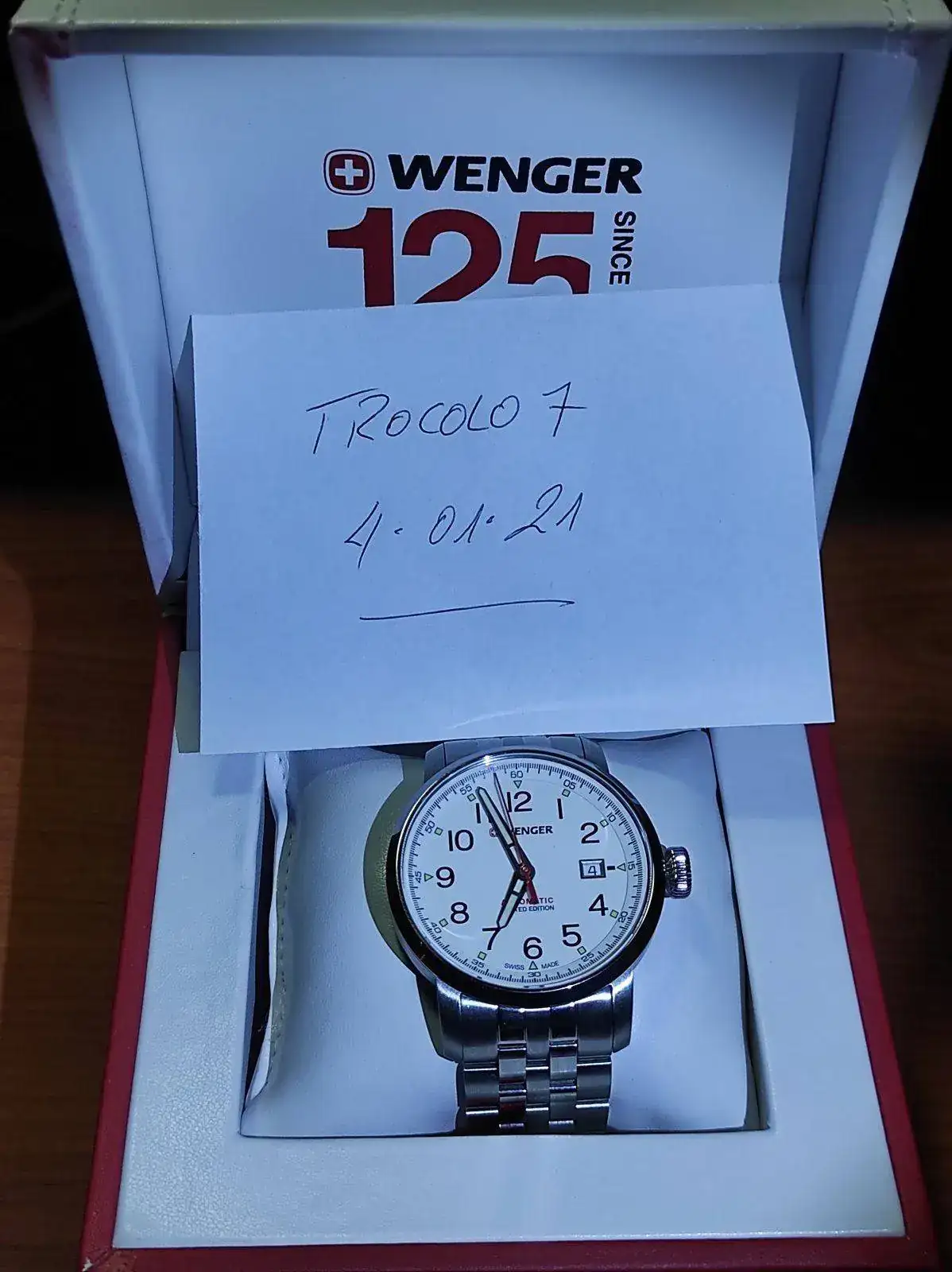 Feliz año nuevo a todos. Vendo este bonito Wenger Attitude Limited Edition de reestreno. Es automático y monta un Eta2824-2 muy bien ajustado. Lo tengo en el watchwinder desde que llegó para comprobar la marcha y como digo, va perfecto. Tienen muy buenos acabados y un lumen bastante bueno. El reloj trae correa de piel y deplo firmado y también pedí el brazalete, para alternar ambos. Comprado a mediados de diciembre, lo he utilizado en dos ocasiones, por lo cual está impecable. Lo vendo para financiar la compra de otro. Viene completo, caja, papeles y garantía. El precio, 270 euros con envío incluido. Con el armis, en tienda sobrepasa los 400 euros bien a gusto.