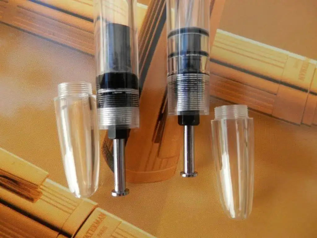 No le falta de "ná": su "joyita" anacarada rematando el capuchón, el clip en forma de flecha, el culote a rosca, el diminuto plumín oculto, el sistema de bomba de vacío... Wing Sung ha tuneado la versión de la "Vacumatic" con una ventanita para controlar el nivel de tinta y ha incluido en la dotación de su "novedosa" estilográfica una jeringuilla con grasa de silicona y una llavecita de tubo para desmontar la rosca hexagonal que cierra el mecanismo de vacío. Todo ello va en una cajita de cartón negro (parecida a las de las Lamy Safari) en la que se adjunta un prospecto de instrucciones en chino. Para los que no sabemos chino han puesto unos dibujitos de los que parece deducirse que la pluma se puede desmontar por completo. Y así es: la sección de agarre y el conjunto formado por el plumín, el alimentador y el tubito de respiración se pueden desenroscar a mano fácilmente, mientras que el resto del mecanismo de llenado sale una vez que se quita la rosca trasera.