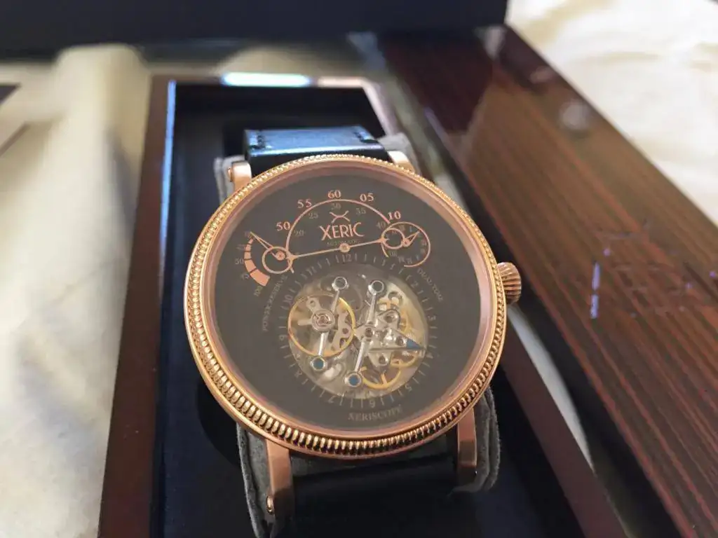 Hola, para hacer caja para una pieza mayor estoy vendiendo todos los relojes que no uso. Saco a la venta este reloj automático que creo es el primer Xeric que aparece en el foro, el Xeriscope. Este reloj es curioso, fue lanzado por la gente de Watchisimo a través de crowdfunding en Kickstarter, y los vendieron como churros. De hecho, yo no llegué a tiempo y lo compré posteriormente en Watchísimo meses después. Es un reloj como podéis ver terriblemente original, con una lectura horaria que no deja indiferente a nadie y que llama la atención a todo el mundo. La lectura de las horas se hace viendo hacia donde apunta la flecha del carrusel donde el volante se desplaza, cada doce horas, como la aguja horaria, y arriba la "aguja" minutera gira y viendo si el círculo de arriba o de abajo dónde está posicionando sobre los números, puedes leer los minutos. Y aparte un indicador GMT y de reserva de marcha. Al principio se hace un poco raro, luego se lee sin dificultad (la realidad es que te fijas en la posición de la minuteras, y según esté las "lees" como en un reloj normal). En la foto de arriba, marca las 3:59. De este reloj me encanta ver el volante y el áncora en movimiento junto al carrusel dando vueltas.