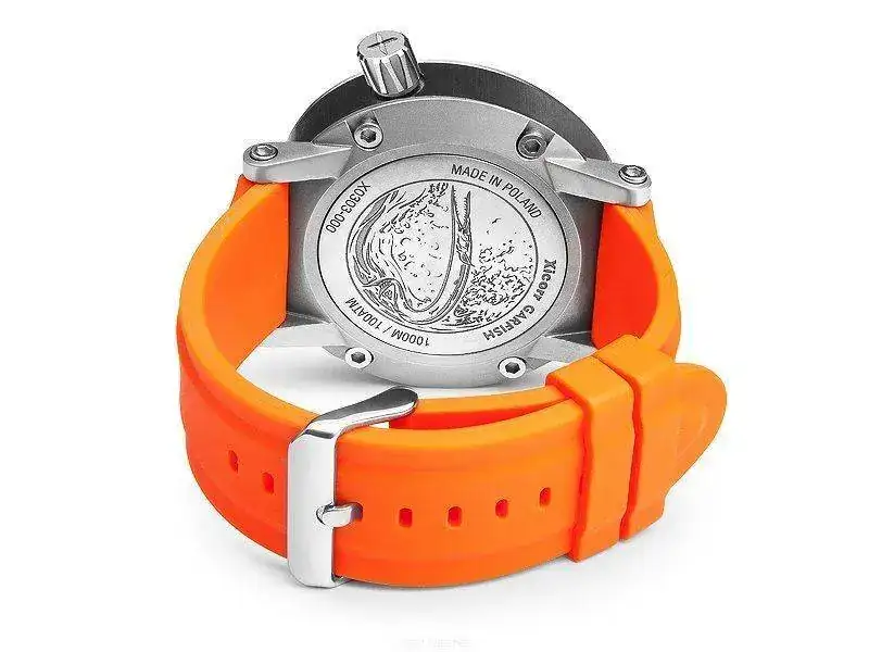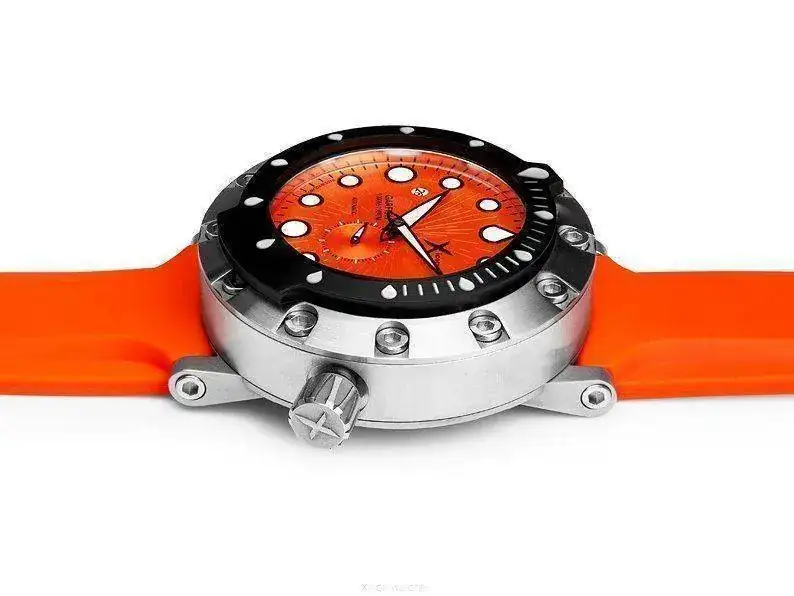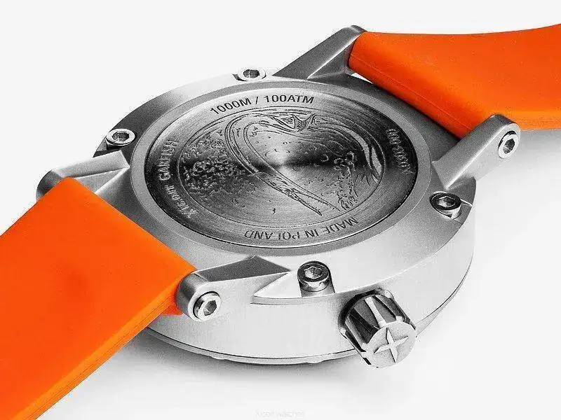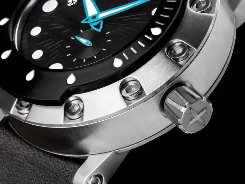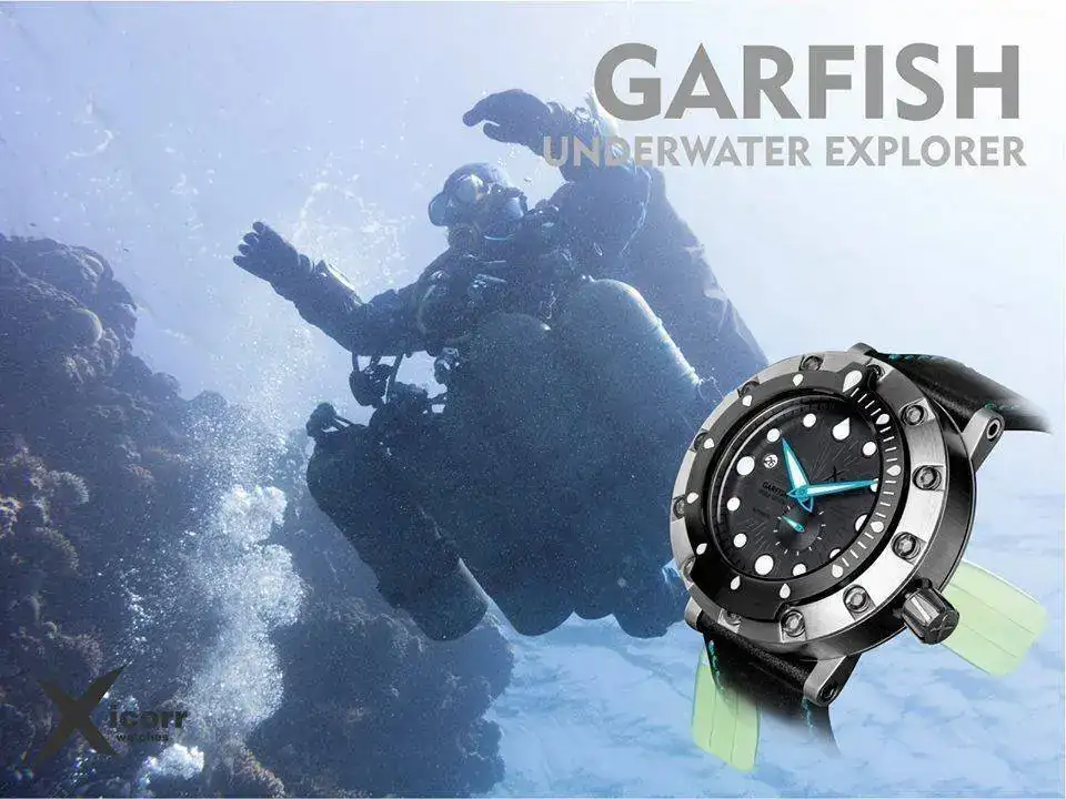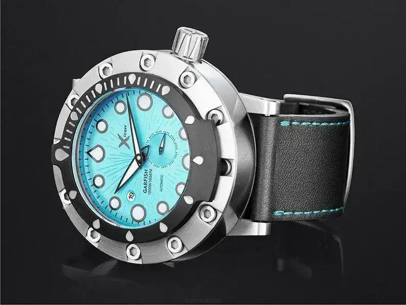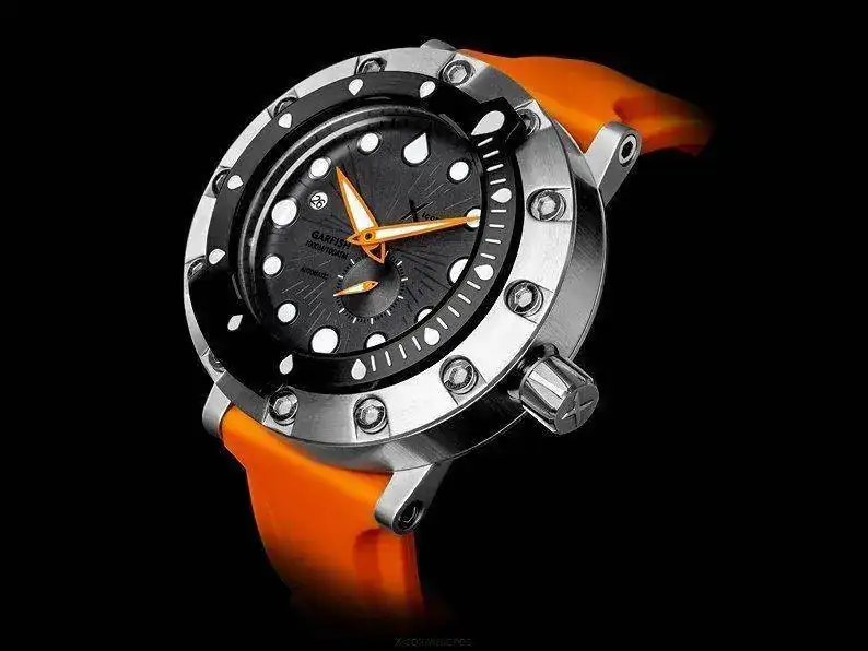 , sino que se realizó la prueba con el correspondiente buzo... lo siento, no recuerdo su nombre). Aquella inmersión supuso por aquél entonces un nuevo récord mundial de profundidad de buceo.Ahora presenta el Garfish. Es un auténtico monstruo, con caja de nada menos que 52 mm de diámetro. Pero eso no es mayormente su seña de identidad, sino que hay elementos que me han llamado poderosamente la atención. El primero, su estética steampunk, con la contundente tornillería en la cara superior de la caja (que no bisel).