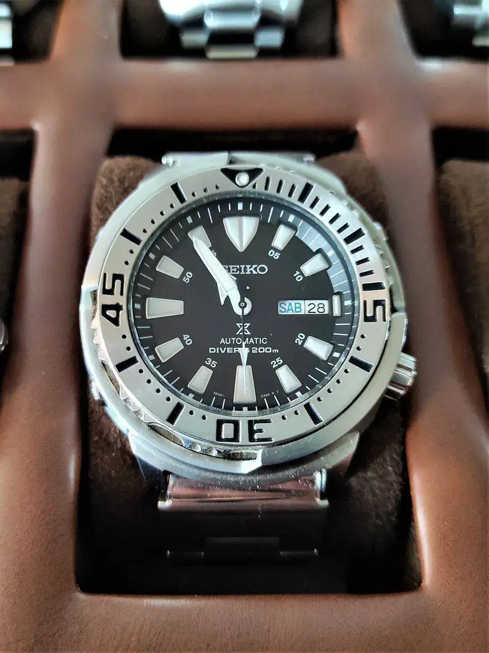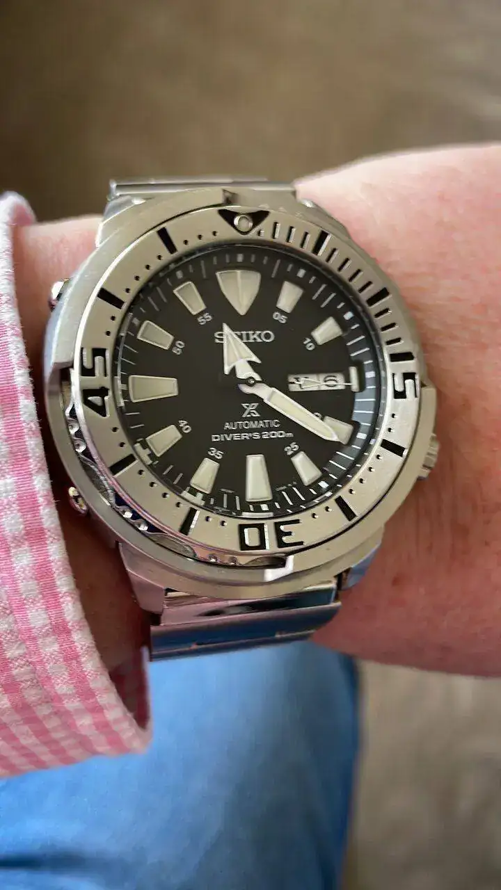 Empiezo con uno muy especial, ya que es el único que puede presumir de haber estado en todas las presentaciones (caja de los 1k, 2k y 3k mensajes), un auténtico superviviente que ha visto desfilar decenas de relojes logrando esquivar siempre la bala, lo que indudablemente le otorga galones en la banda, se trata del veterano y contundente Seiko SRP637 “Baby Tuna”, con movimiento 4r36.