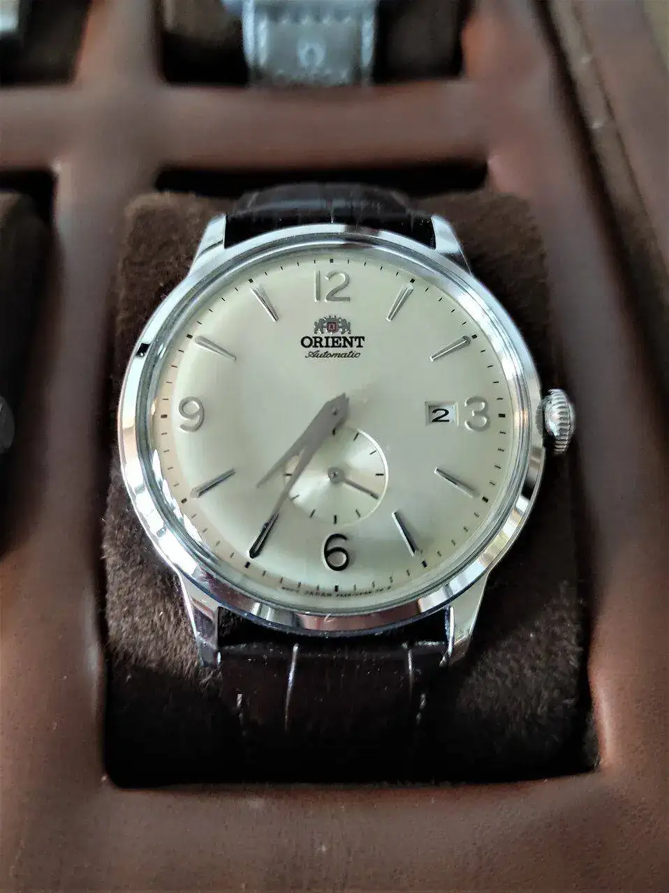 Pasamos a un rara avis en la caja, ya que es el único de menos de 42mm. La verdad es que no lo uso demasiado al ser poco de mi estilo, pero lo disfruto casi igual viéndolo en la caja. A pesar de ser el más económico que tengo, suele llevarse piropos cuando lo llevo, algo que no me sucede con relojes mucho más caros. Se trata del elegante Orient RA-AP0003S10B, más conocido como Bambino Small Seconds de esfera color champagne. Monta el movimiento propio de Orient F6222.