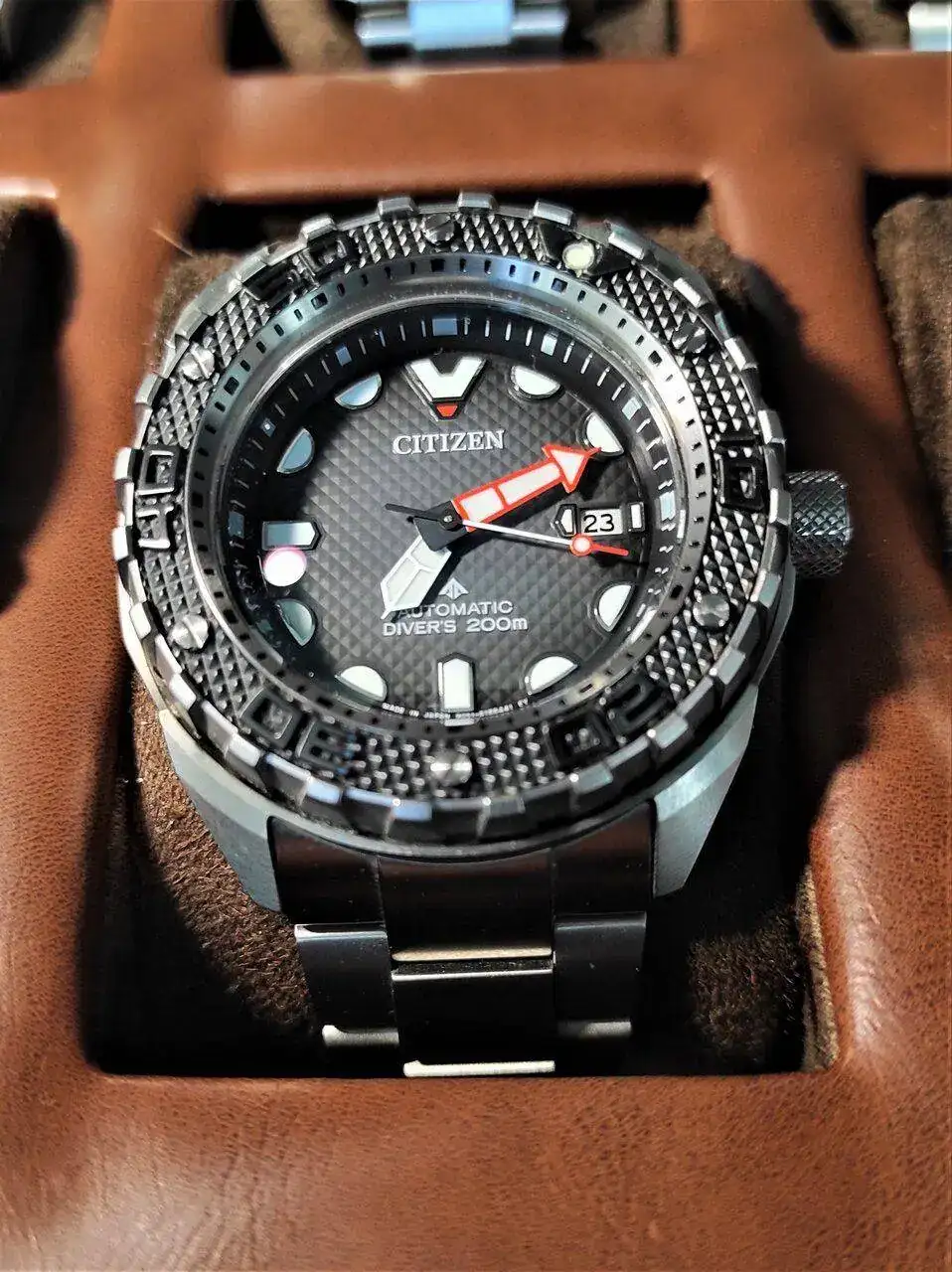 Cambiamos de marca pero seguimos en tierras niponas, un Citizen con uno de esos diseños tan mazacotes que solo ellos saben hacer con gracia, el Promaster NB-6004-83E, una bestia de 46mm que salió el año pasado y me cautivó precisamente por ese aspecto excesivo, aunque he de decir que una vez puesto, sus cortas asas y un peso contenido gracias a lo que Citizen denomina Supertitanium (hasta el curioso bisel es de este material), lo hacen más llevadero de lo que puede aparentar a simple vista. En su interior lleva una Miyota 9051, lo que también lo hace interesante al ser el regreso de Citizen a los divers con movimientos mecánicos, normalmente más centrado en sus conocidos Eco-Drive.