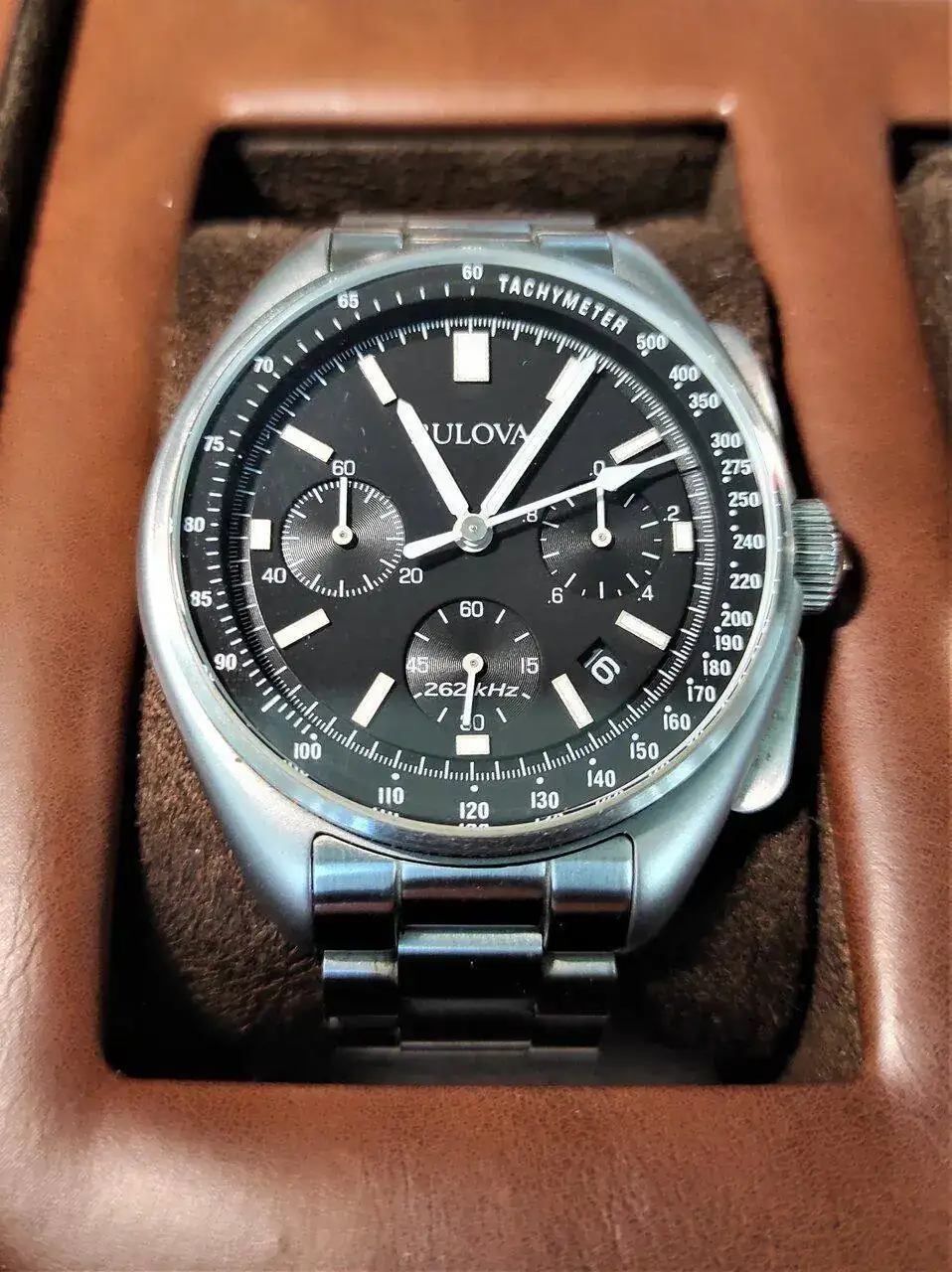 El siguiente cuarzo es el conocido Bulova Lunar Pilot, un reloj cuyo diseño con esos pulsadores de gatillo, e historia contada muchas veces en el foro, hizo que rápidamente lo deseara, así que cuando tuve la oportunidad en el FCV me hice con él. Suelo leer aquí a compañeros que dicen descartarlo por su tamaño, cosa que me parece un error, ya que aunque se le suele nombrar por el tamaño de su caja (45mm), en realidad el bisel es de menos de 42mm. Su largada es cierto que se va hasta los 53mm, que no es poco, pero tampoco es algo excepcional (mi muñeca es de17cm y no me sobresale). Ahora hace un tiempo que no lo uso porque lo tengo parado a la espera de llevarlo a un relojero en condiciones para cambiar la pila, y es que no quiero que cualquier “cambiapilas” me marque la bonita trasera con la mención a la misión del Apolo 15. Cuenta con el calibre 8136 de origen japonés que vibra a 262 Khz y garantiza una desviación de 5 segundos al mes, que en mi caso aún era mejor, ya que siempre iba clavado (hasta que se quedó sin pila…)