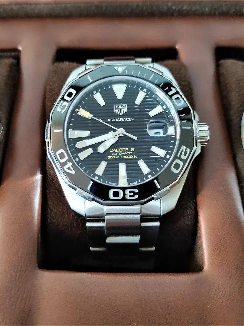 El siguiente fue mi primer reloj de cierto nivel, regalo de mi mujer por nuestra boda después de muchos años en pecado, así que lógicamente le tengo un cariño muy especial, es un Tag Heuer Aquaracer Calibre 5 de color negro, que es como TH renombra los Sellita SW200 o ETA2824.