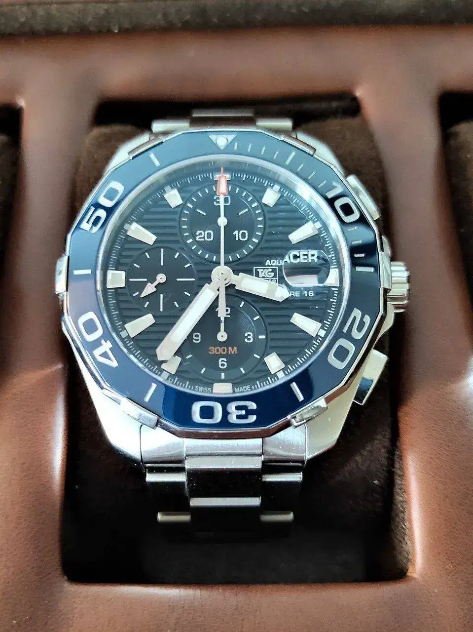 El penúltimo no sé si es el mejor de mi colección, pero sí es el más caro, y curiosamente a la vez, el que menos me gusta. Primero porque la mezcla de diver y crono no me termina de convencer, y después porque comparte varios elementos repetidos con el anterior que os he enseñado, ya que se trata de otro Aquaracer, aunque en esta ocasión en un bonito color azul y con calibre 16. Llegó a mi caja a través de un regalo, así que tampoco me puedo quejar, pero lo cierto es que lo uso muy poco, con vistas a que algún día me sirva de puerta de entrada a otro de gama superior.