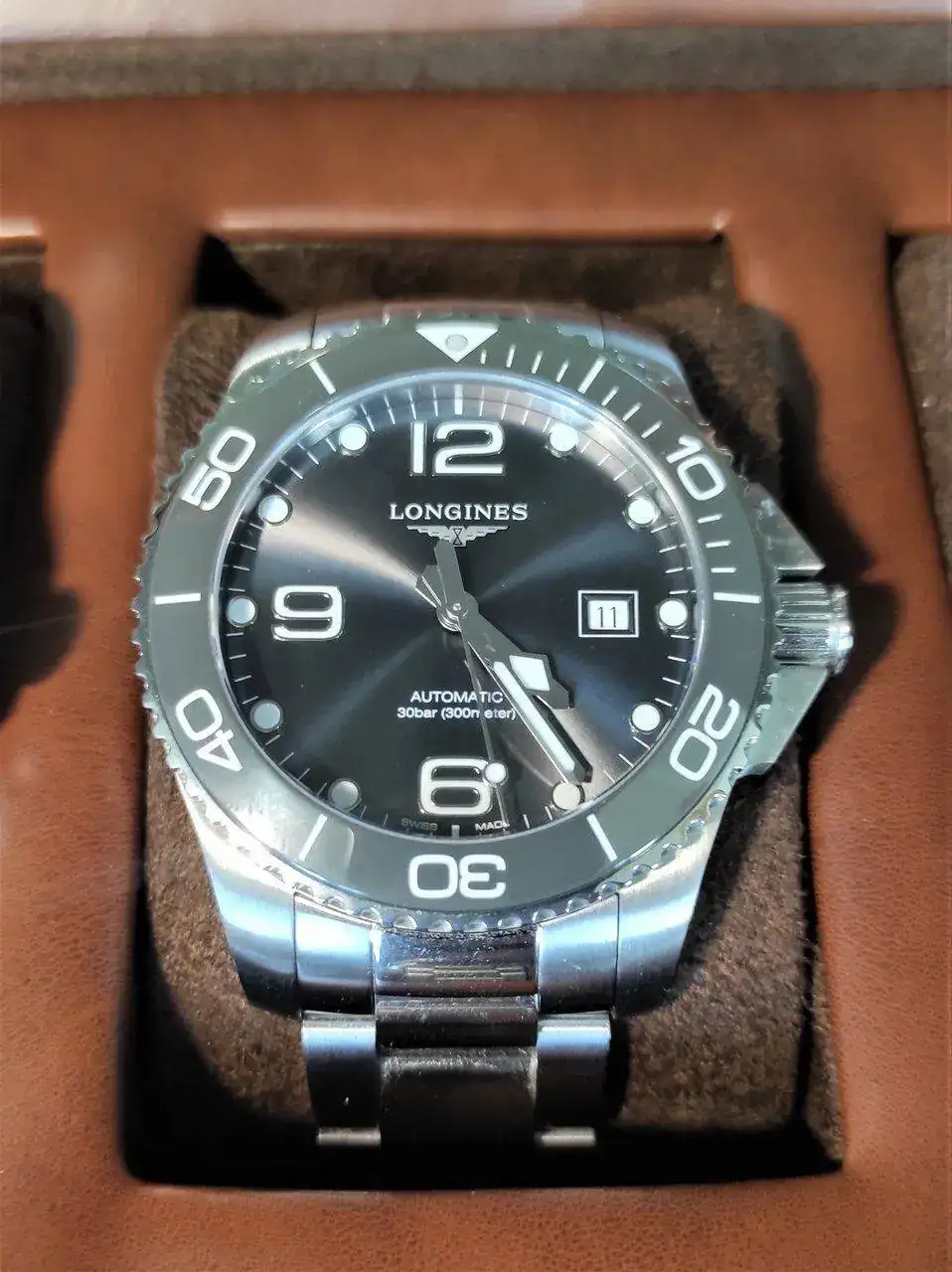 Y llegamos ya al final con la última incorporación de hace apenas dos semanas, lo que como bien sabéis, lo convierte automáticamente en el niño bonito de la caja, al menos hasta que sea desbancado por la siguiente novedad, un Longines Hidroconquest de 43mm. Desde que lo he recibido no ha salido de mi muñeca, y a menudo me quedo embobado viendo los reflejos en su esfera gris. No suelo prestar atención a las desviaciones salvo detectar algún problema evidente, pero sí lo controlo los primeros días que recibo un reloj, y en este caso, en los 16 días que lo he llevado de forma seguida ha avanzado 33 segundo, y además lo ha hecho de forma constante (+2 segundos/día), lo que me parece una marca extraordinaria para un reloj de su segmento. Aprovecho también para decir que lo adquirí a través del patrocinador del foro “Manzanares Joyeros”, recibido en menos de una semana y todo perfecto.