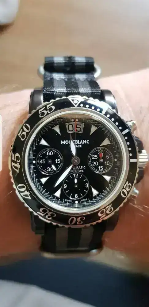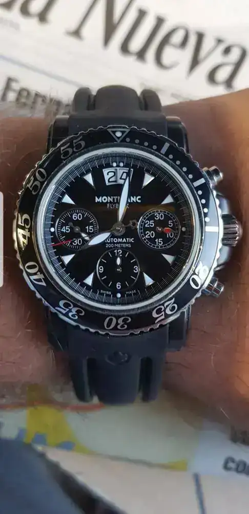 Crono Valjoux invertida modificada por Montblanc con flyback y big day. WR 200m con corona roscada y sin pulsadores roscados. Caja de 41'5mm en PVD/DLC negro. Bisel "clasico" unidireccional.