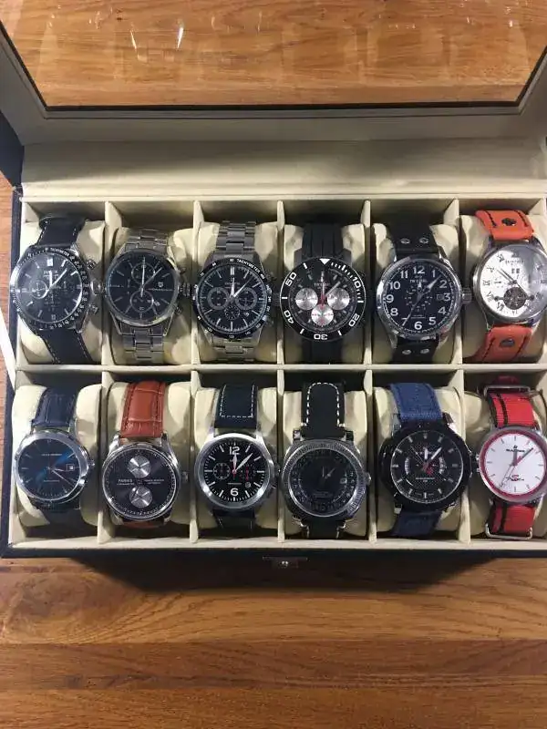 Para muchos, la caja B es la olvidada, la que pocas veces ve la luz y que guarda piezas con valor sentimental pero escaso valor relojero. Esta es la mía ahora pero hace unos meses era la única caja que tenía y me sentía muy orgulloso. Sigo sintiendo lo mismo. Os la presento de izquierda a derecha primera fila y segunda.