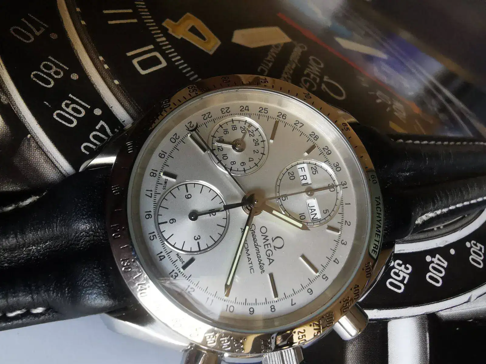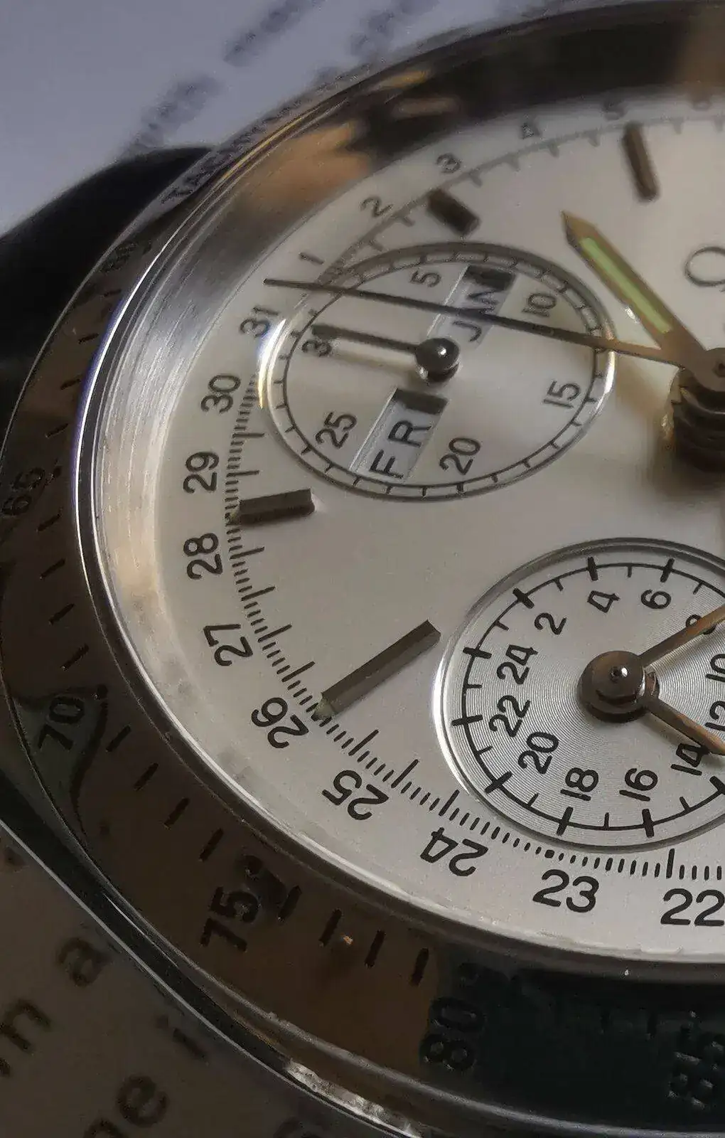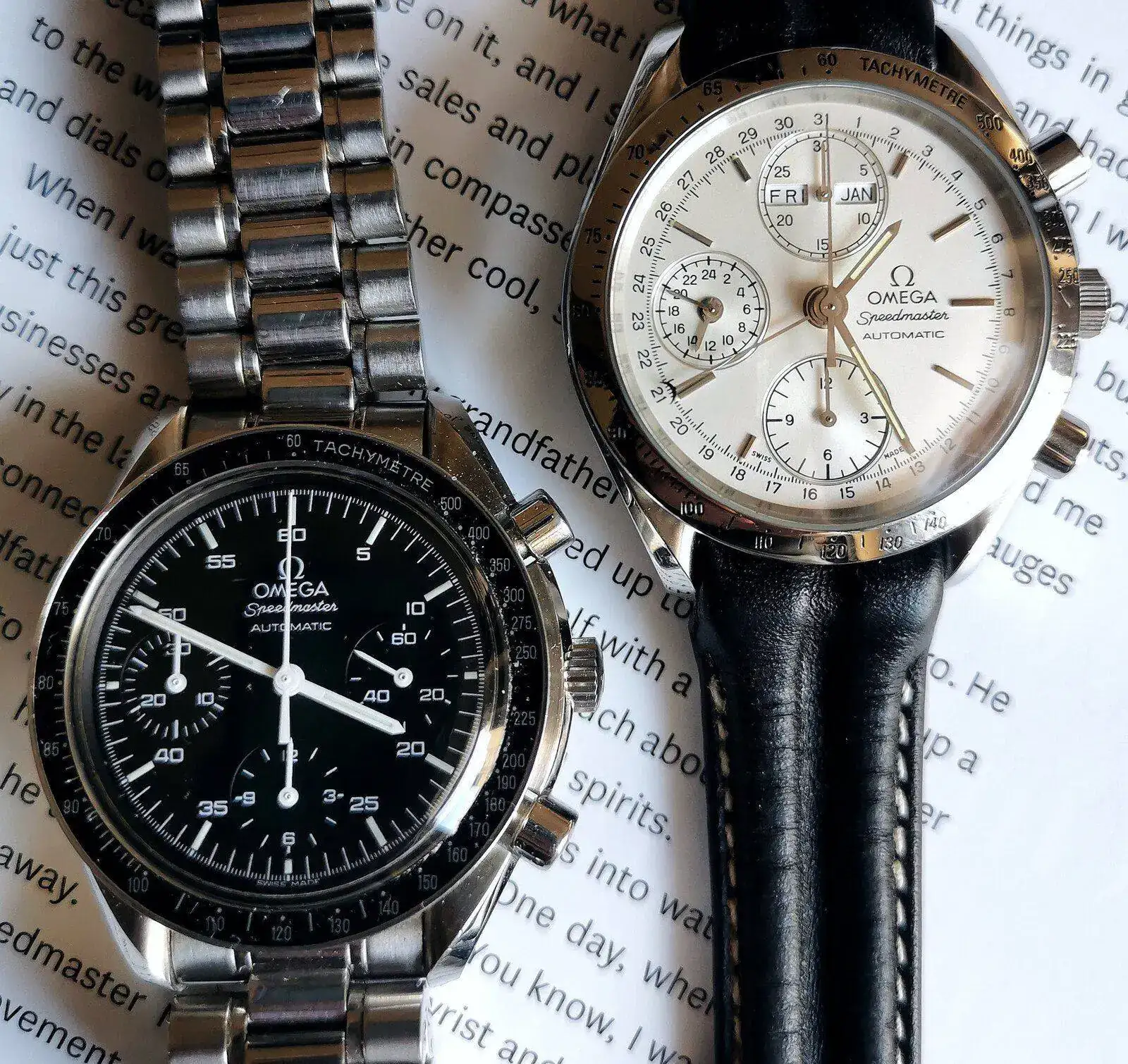 Pues nada que se me ha cruzado por el camino de nuevo (he estado apuntito de comprar alguna de sus variantes en el pasado), un Omeguita SpeedMaster Day Date, también conocido como "Triple Date", Chrono por supuesto, con esfera plateada y esas subesferas que no paraban de ponerme ojitos cual perrillo abandonado, suplicando compartir caja con su hermano morenito, el Speedy reduced que ya he mostrado en tantas ocasiones en el hilo diario.