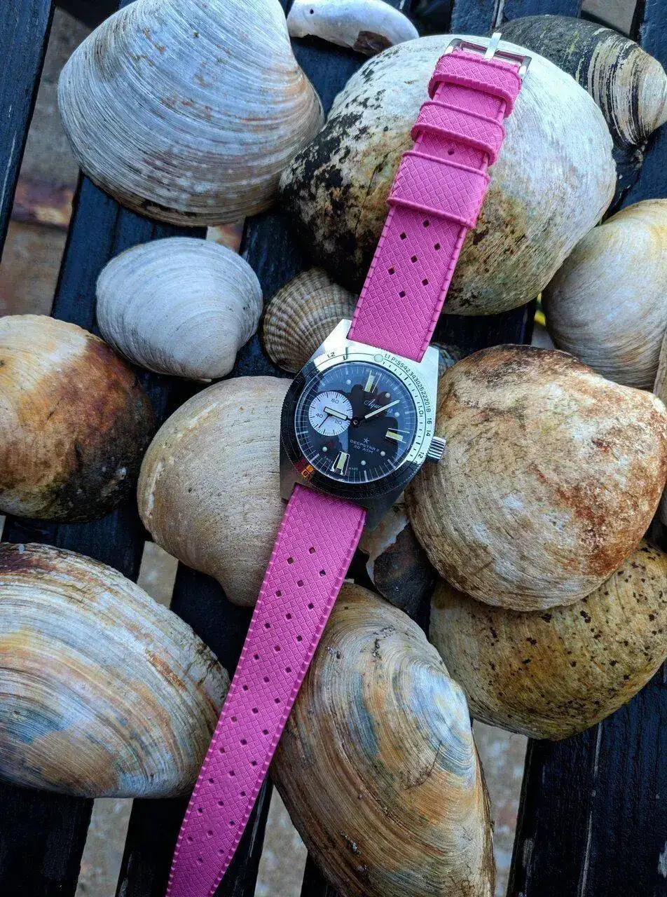 Tengo una sensación agridulce, no obstante, ya que si bien reconozco que me gusta muuuucho el resultado de ese momento de revelación verano-diver-caucho (bellísimo e intemporal el diver elegido y atractivo y singular el caucho localizado), debo confesar que me ha decepcionado un poco tras las expectativas creadas por un diver fosforito. Reconoce que pasar de un diver fosforito a una Tropic negra.... Vamos, que no habéis arriesgado mucho Paco y tú 🙄 Tenías el Pam para probar una Tropic verde oliva o amarilla, o si eso es muy loco, qué sé yo, una Tropic off-white para el LD.