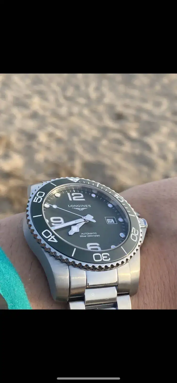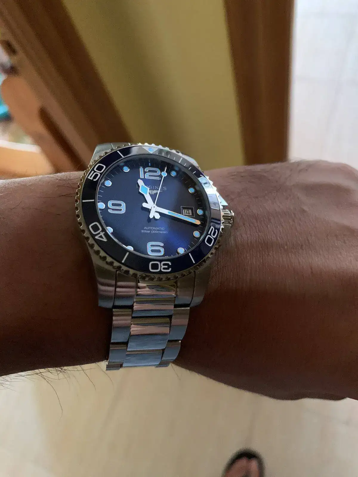 Longines HydroConquest automático de acero y cerámica con cristal de zafiro. Trae la correa de acero y yo a parte le he encargado una de cuero del mismo azul que la esfera.