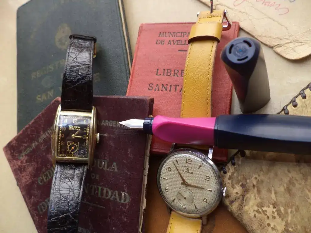 Sé que es una pluma sin caché y sin demasiada estirpe; por eso le adjunto a las imágenes de esta pobre alemanita unos relojitos y unos papeles de hace unos 100 años...