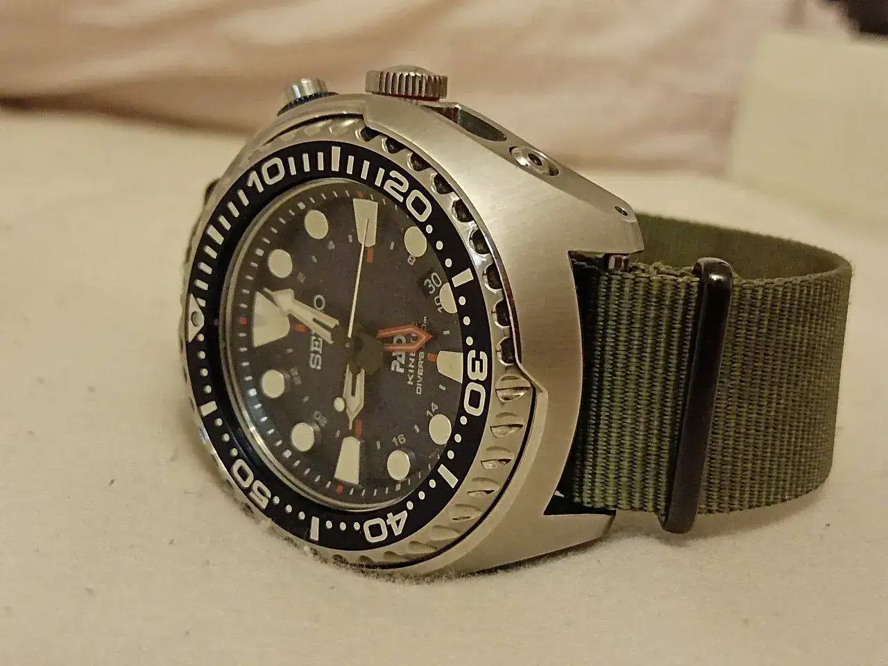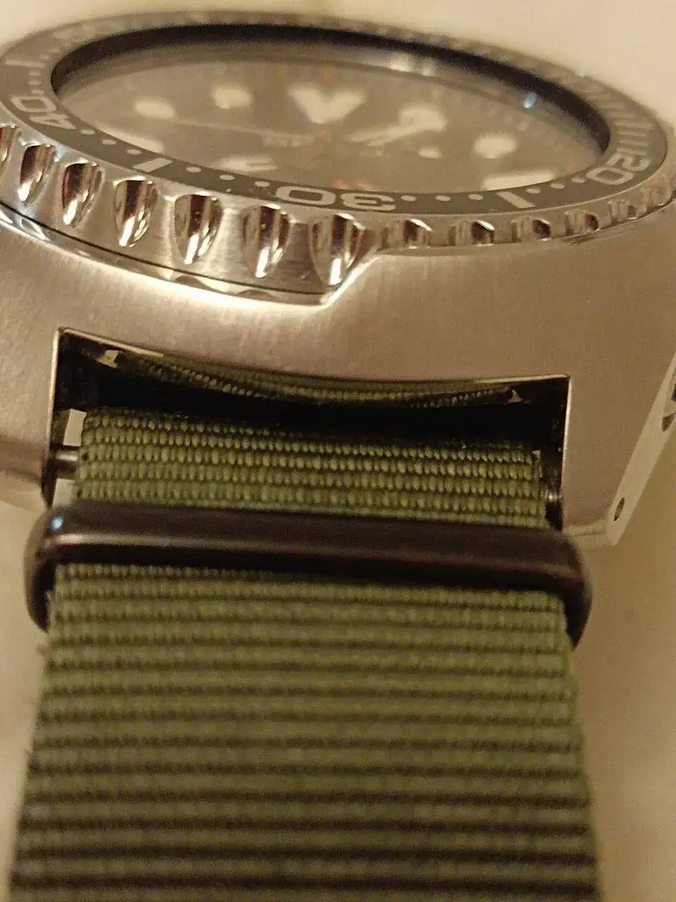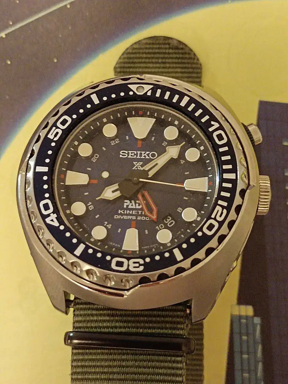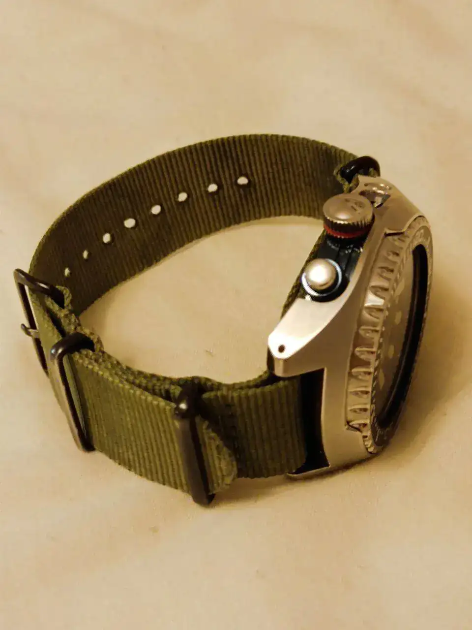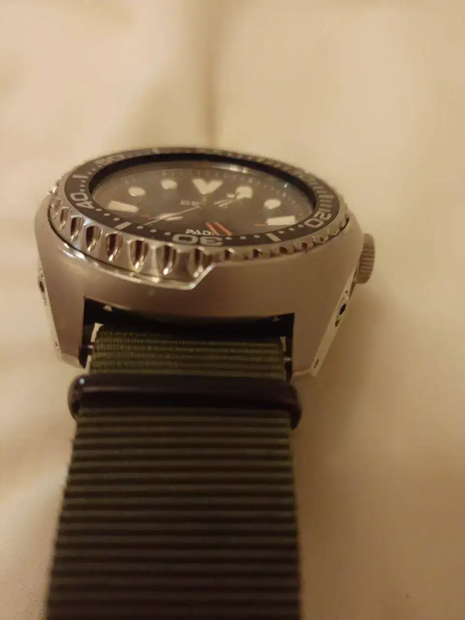 En en este momento el PADI SUN series, modelo idéntico a una de las piezas favoritas del compa Puzzling. Nótese que lo llevo de calle con una Nato de 22 mm cuando sabemos que el ancho entre asas de estos gloriosos tanques es de 24mm. Nato/ Zulú con dos milímetros menos. Así lo tengo adaptado.