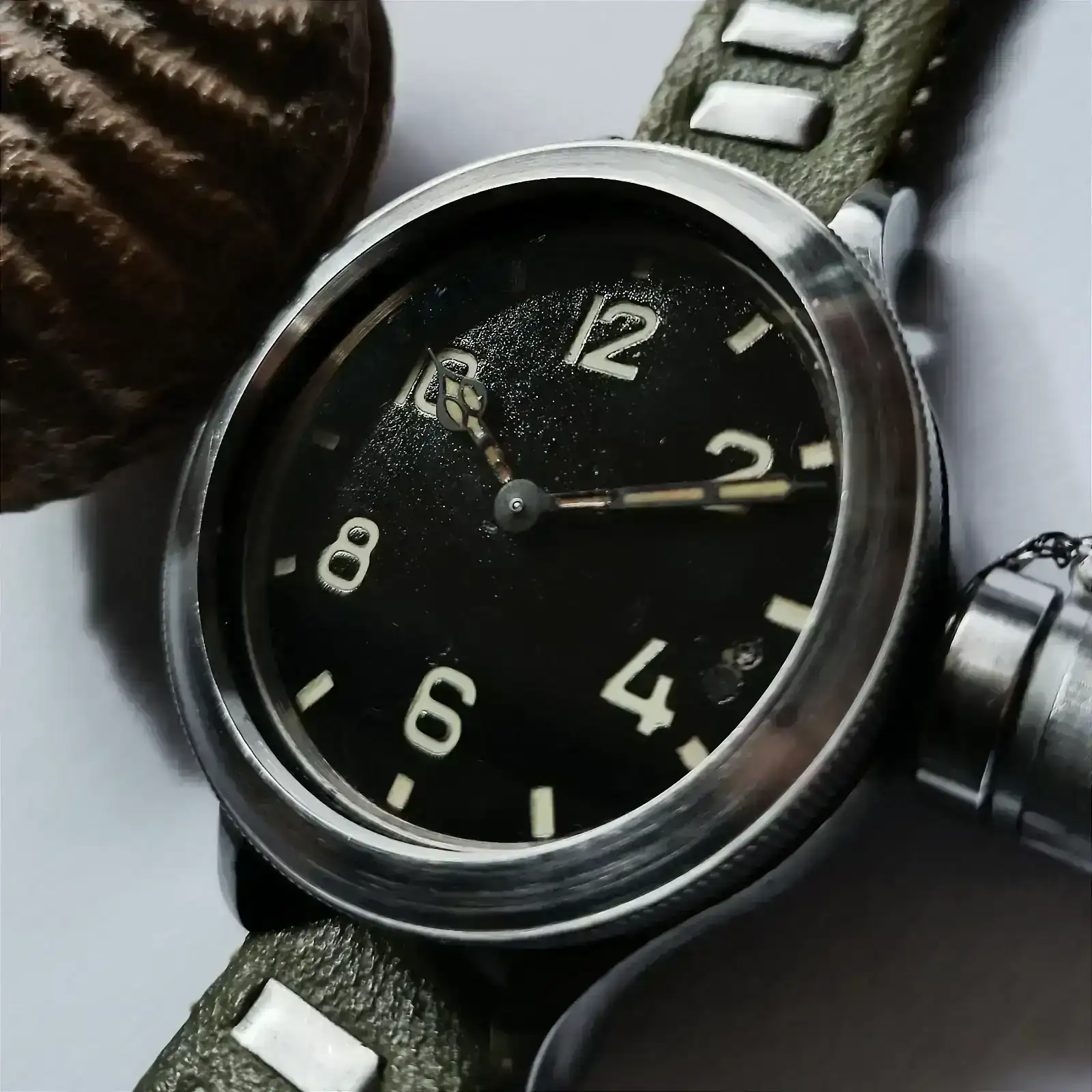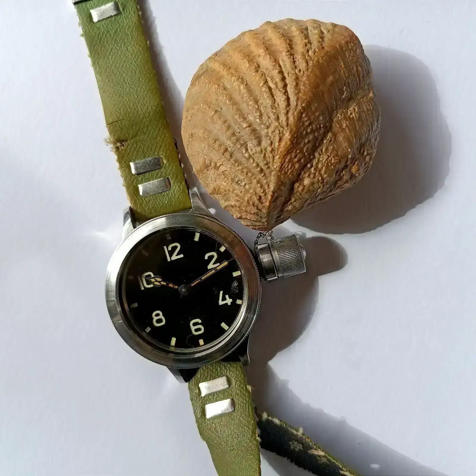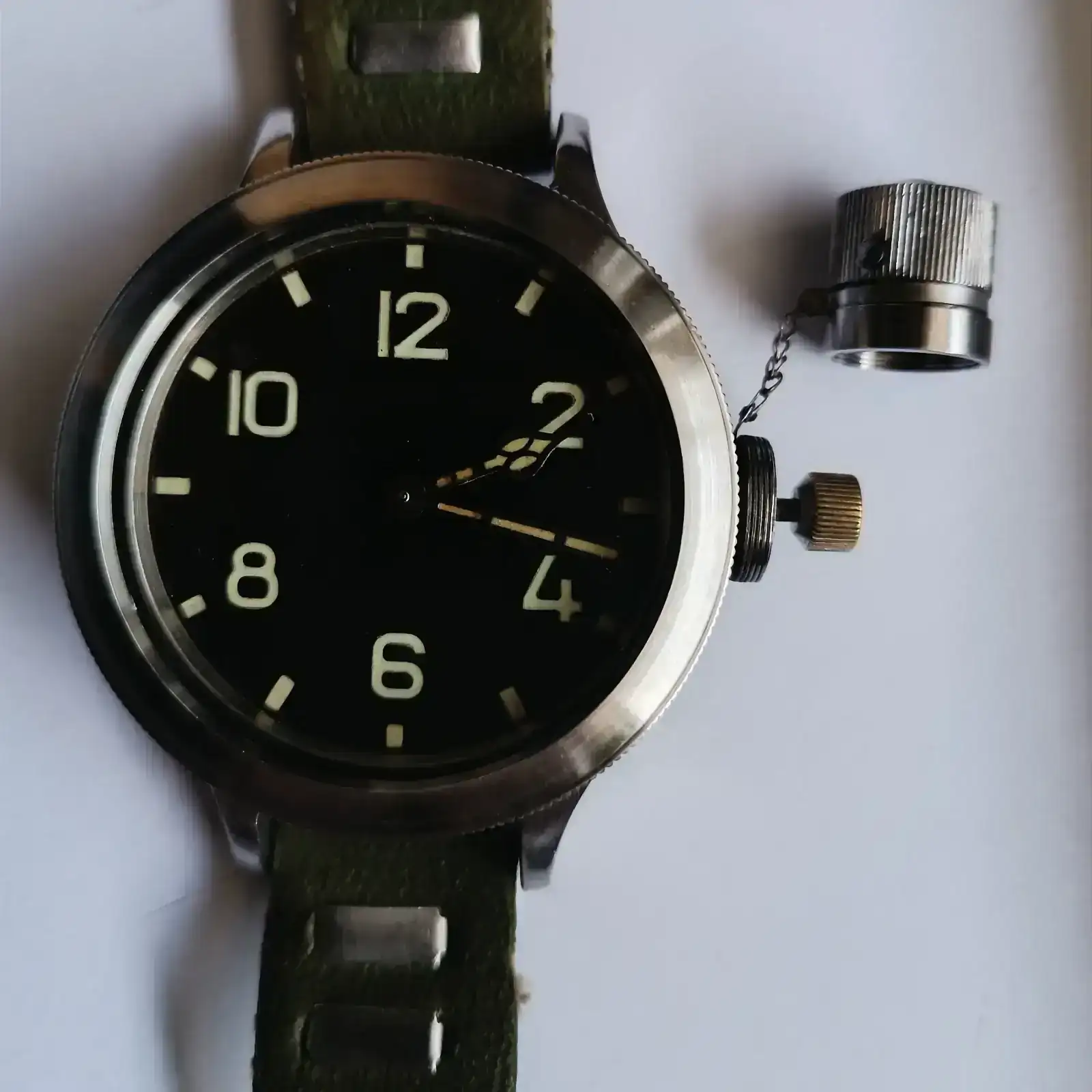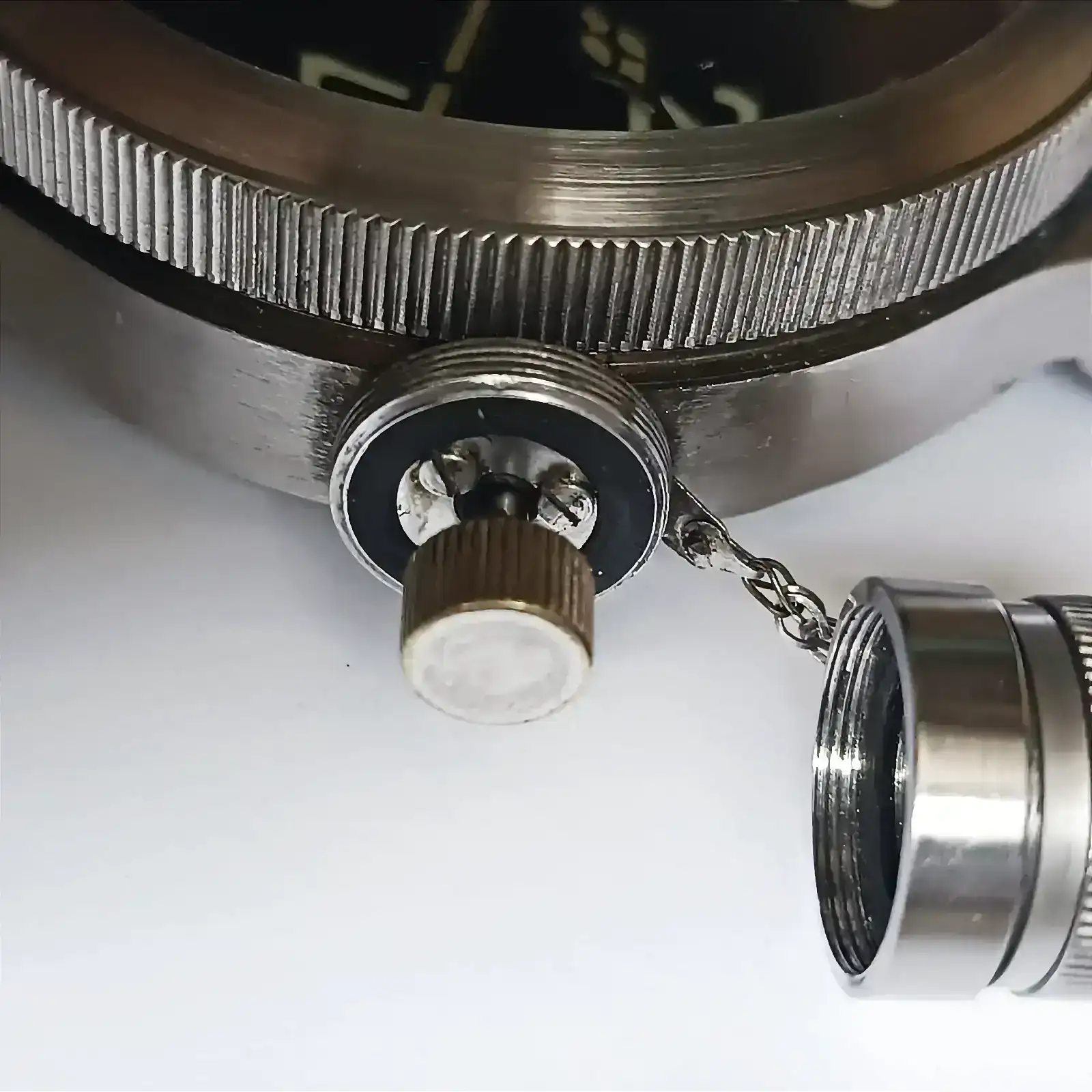 Muchas gracias por enseñarlo! Muy chulo! No había visto algo así antes, me parece muy original.Lo que parece la corona, es en realidad un protector a rosca. Al abrirlo, accedemos a la corona propiamente dicha (de ahí la presencia de esa pequeña cadena, para evitar que el "capuchón" se extravíe). Es un modelo que se remonta a los años 50, a este tipo de diseño se le denomina coloquialmente "canteen watch" por su evidente parecido con una cantimplora. Un saludo compañero y gracias por tu interés.