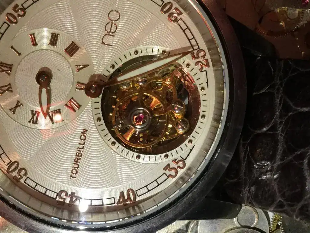 En caja de oro, Cronometro, Escape Co-axial y reserva de marcha.