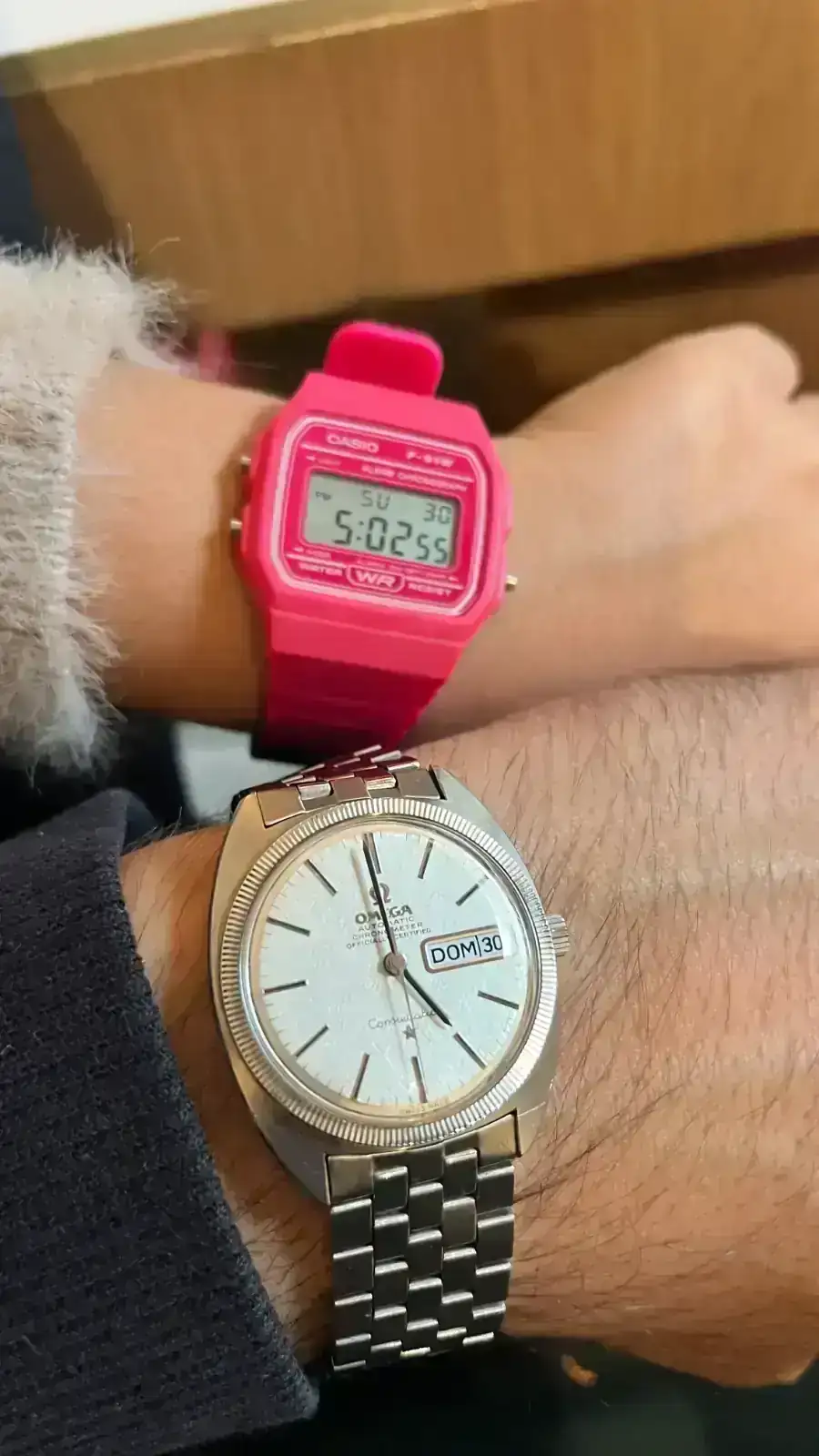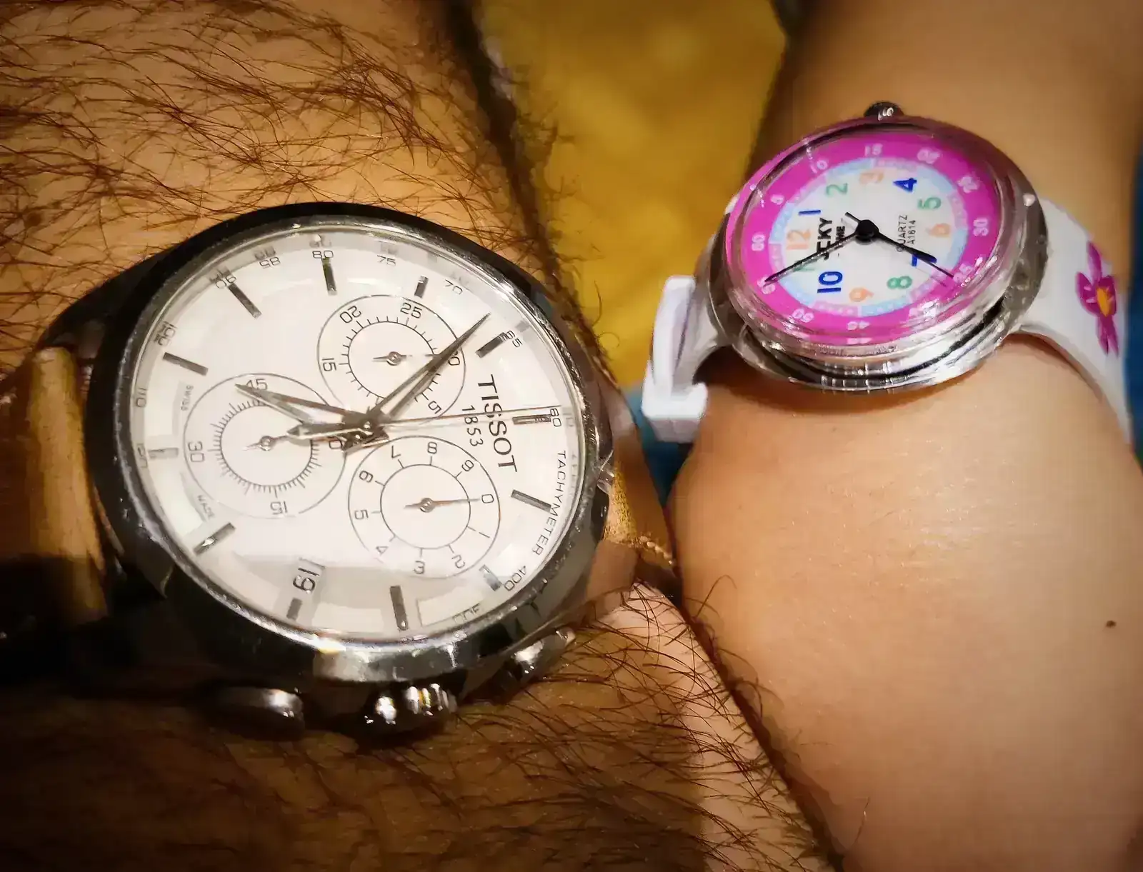 La foto es terrible, pero es que no para quieta la chiquilla. Empieza a mostrar interés y a veces me pregunta, pero el que más curiosidad le despierta es el G-Shock porque tiene un botón con luz :D
