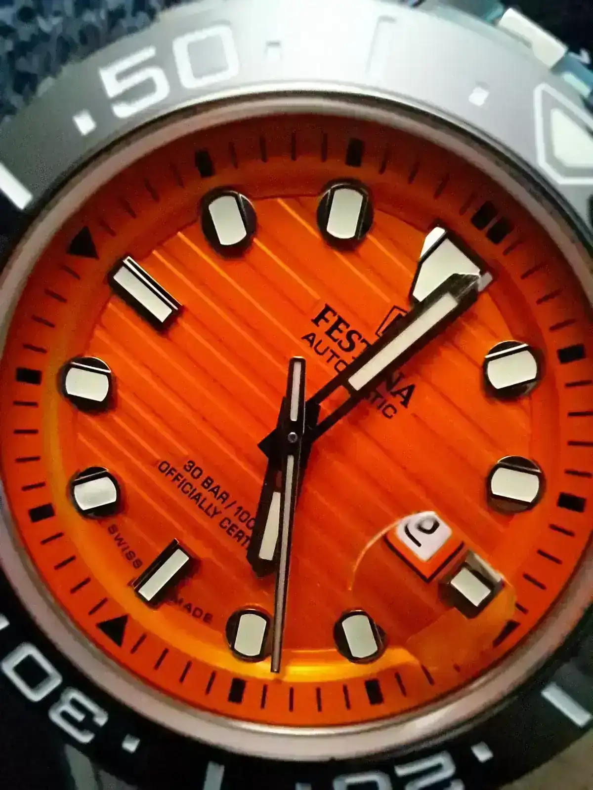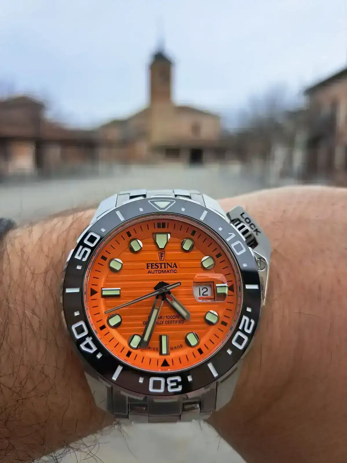 Se trata del Festina Diver, suizo, con el dial naranja (estaba entre este y el amarillo) y sus 47mm de ancho de caja.