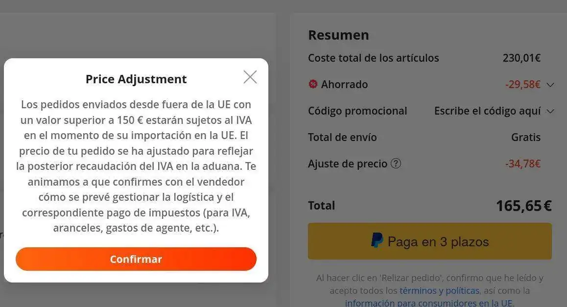 En este caso ellos pagan por adelantado los 23,55 de IVA al enviarlo pero no te lo cobran a ti. Si es más de 150 lo pagas tu y ellos te lo ponen como una "compensación de precio"