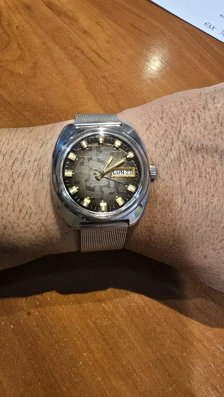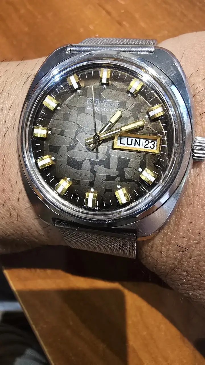 , me ha llegado esta pieza. Es de mi padre, actualmente con 82 años, como veréis por el aspecto setentero, lo compraría cuando tenía unos 30.He pulido el plexi pero tiene alguna grieta por rotura a las 5. Microrallas a punta pala en la caja, pero creo que se quedará así, luciendo las heridas de guerra de todos los años a sus espaldas.