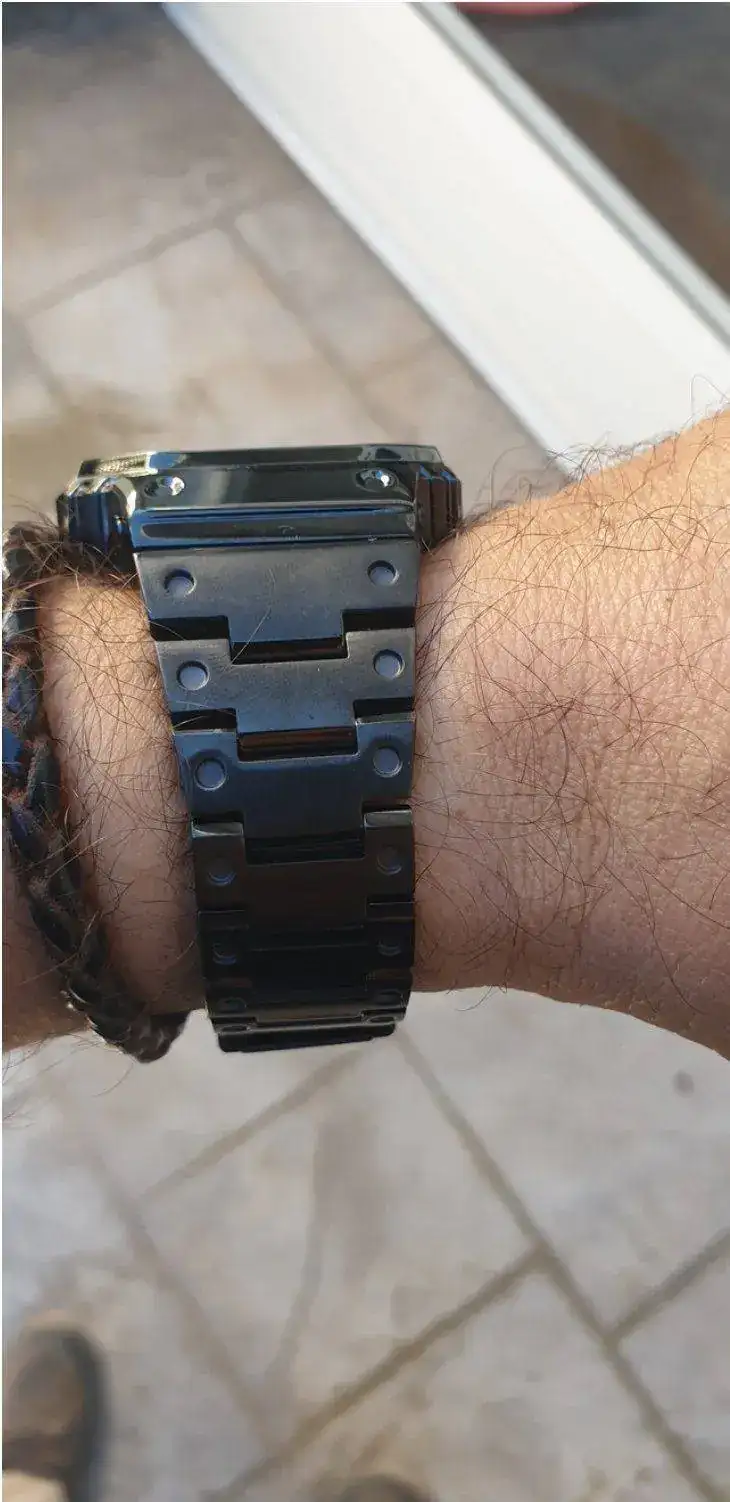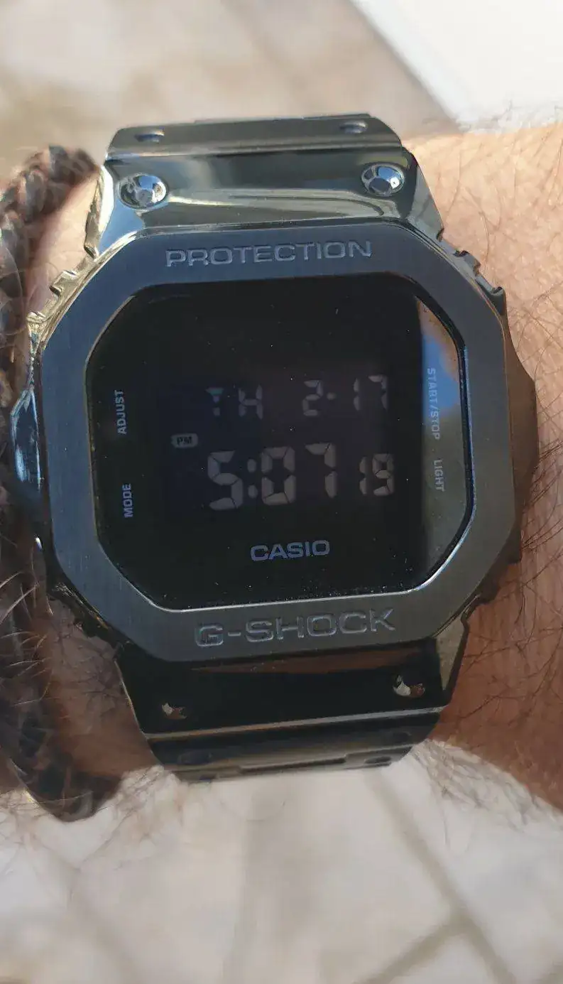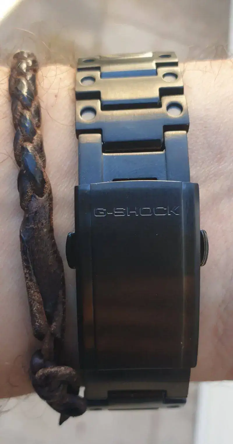 El modelo es el GM-S5600-1JF, mide 43,8 x 38,4 x 10,9, la pantalla es negativa (invertida), algo que a mí me gusta , el frontal es de acero inoxidable y realmente es muy vistoso, no se trata del G-Schok de batalla (literal), es el “de vestir”, pero conmigo no se libra, lo primero que he hecho hoy como a todos los que saben nadar aunque sea poco, es llevarlo al monte e intentar ahogarlo y ha sobrevivido, prueba superada.