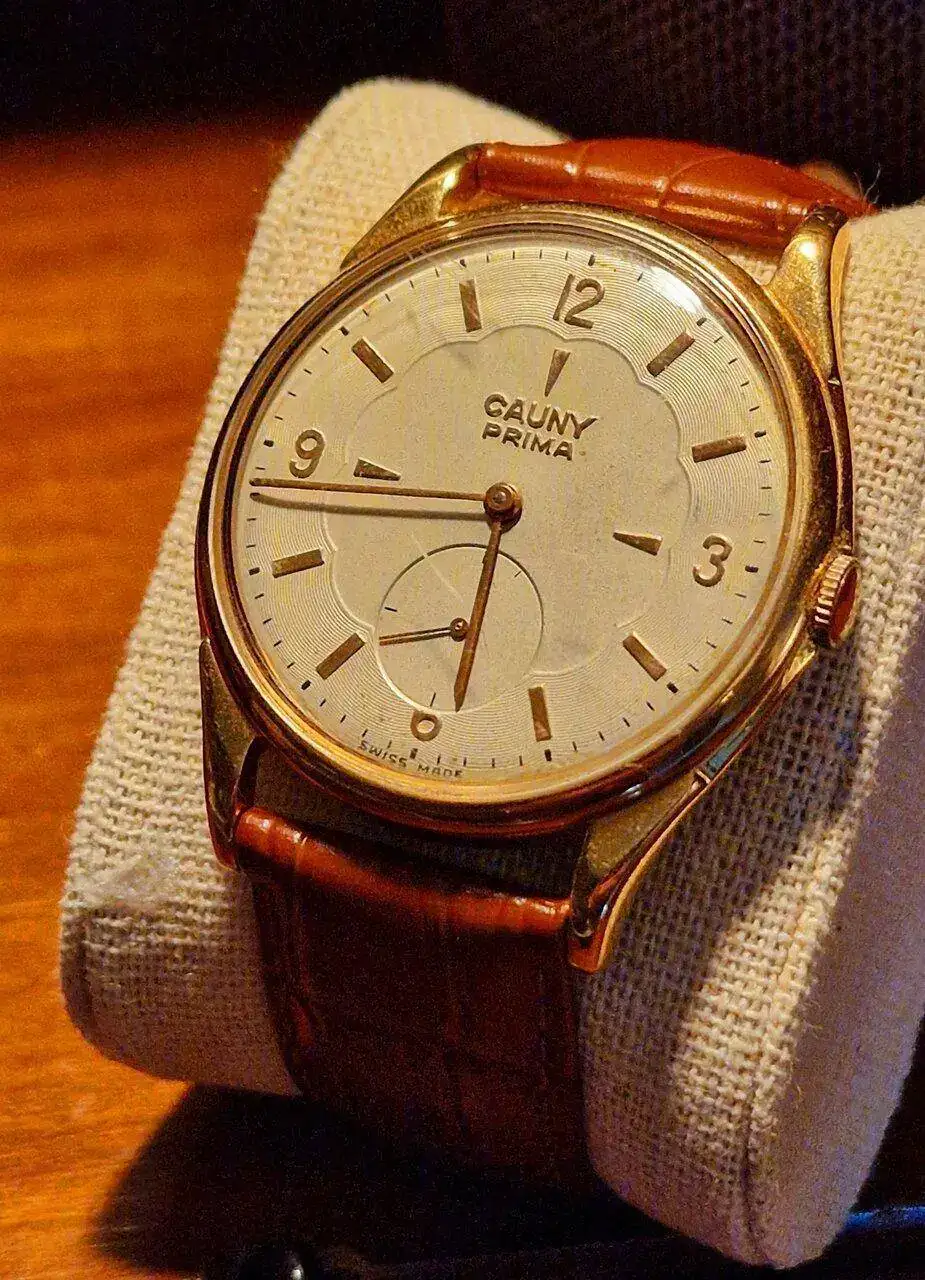 Hace buena pareja con este Cauny Prima que era de mi abuelo paterno (y que heredó mi padre). Este si está restaurado y muy bien por cierto, por relojería Ancora. Sorprende el tamaño, es un Jumbo, enorme para la época: