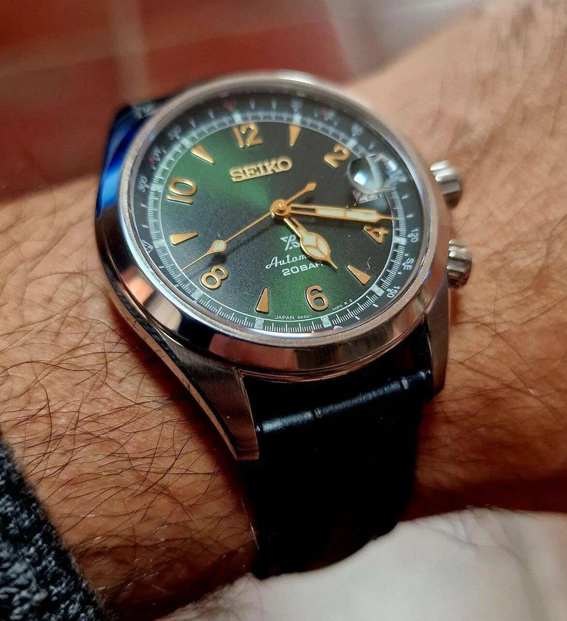 El Seiko Alpinist. Un reloj que podría perfectamente no quitarme nunca. me alucina su esfera verde que pasa del color verde oscuro a un verde vivo con rayos de sol en cuanto le alcanza la luz: