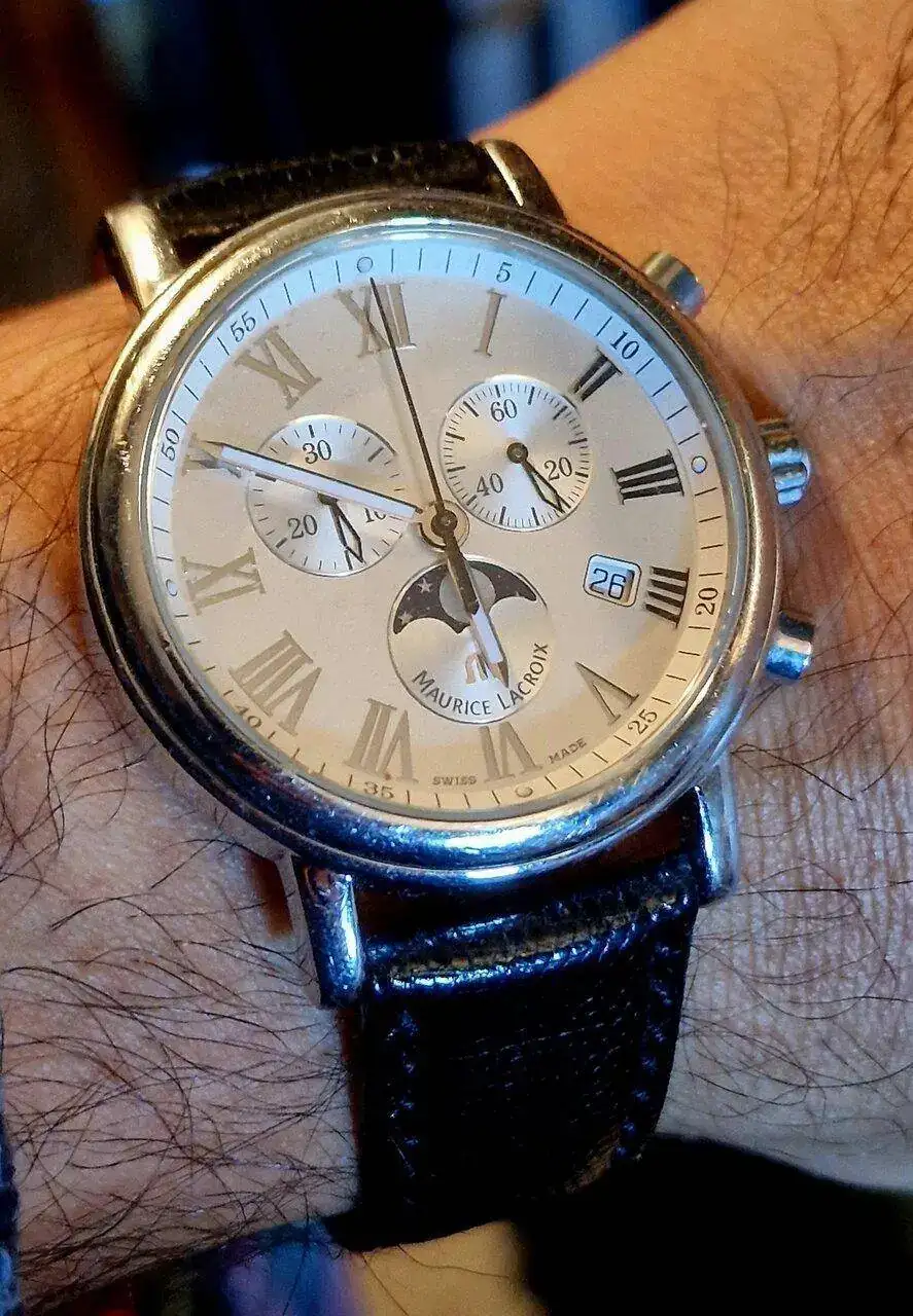Por último y por acabar, mi reloj de bodas, un Maurice Lacroix les Classiques con fase lunar y cronógrafo. Es un cuarzo suizo que va muy muy bien: